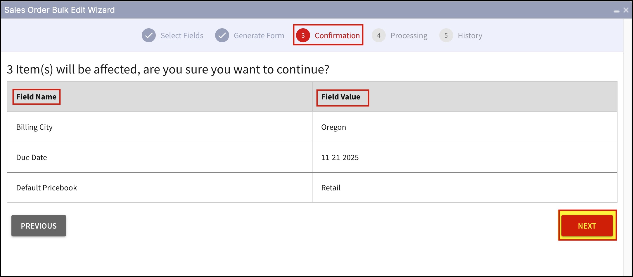 - Here on the Confirmation window, you can see the field names and respective field values of the Sales Orders that will be affected.
