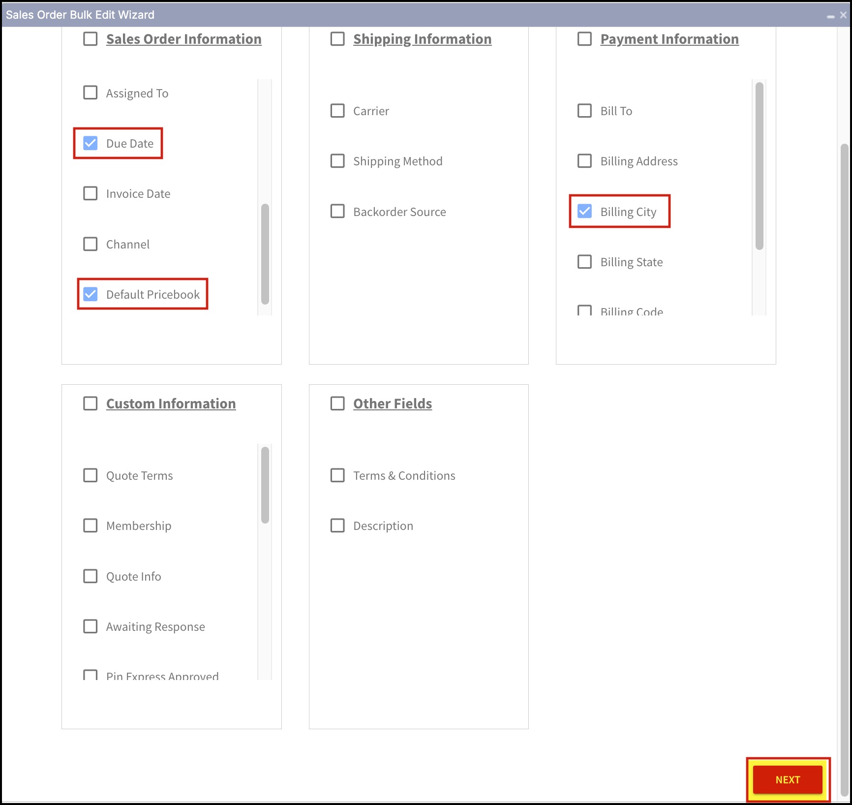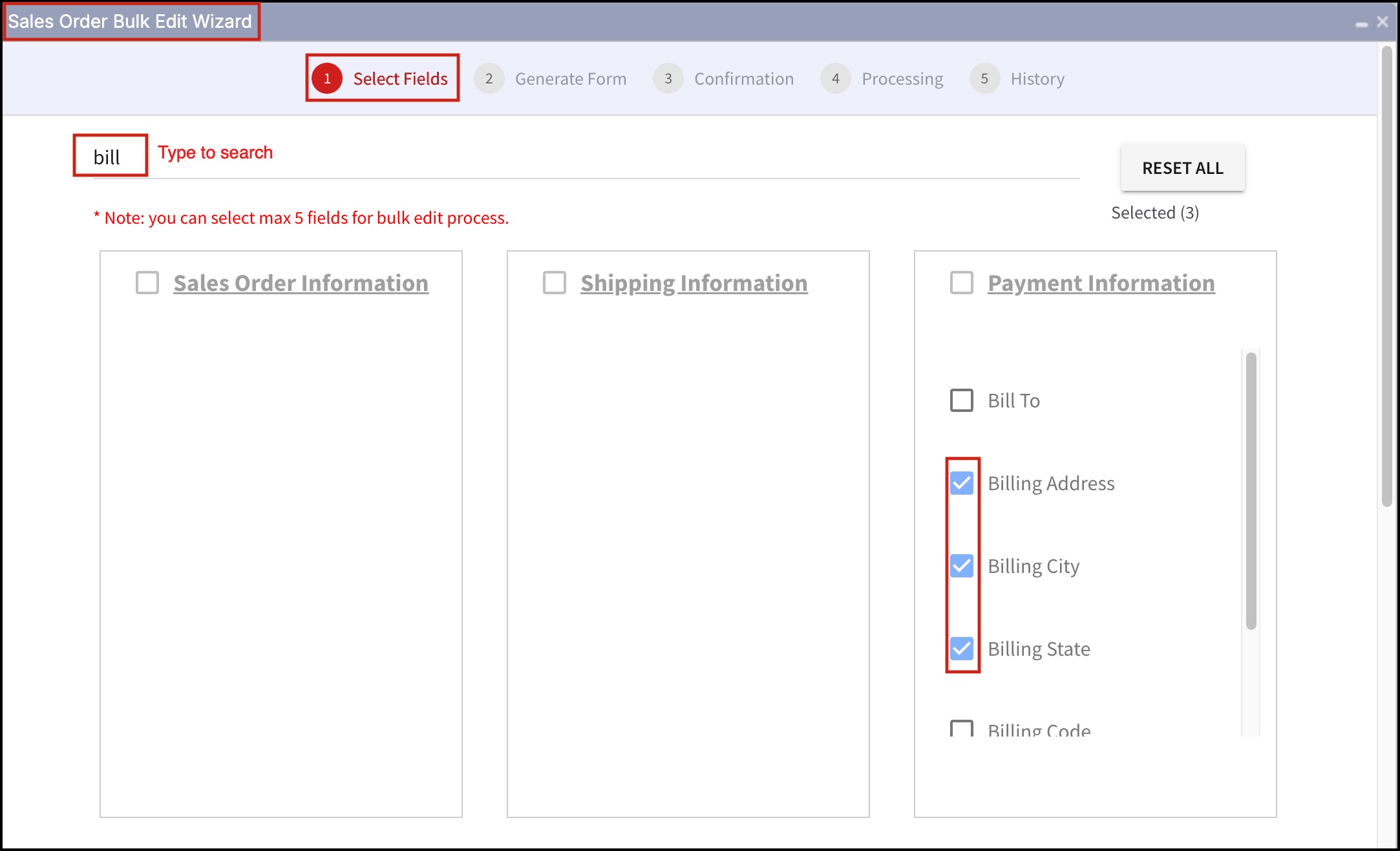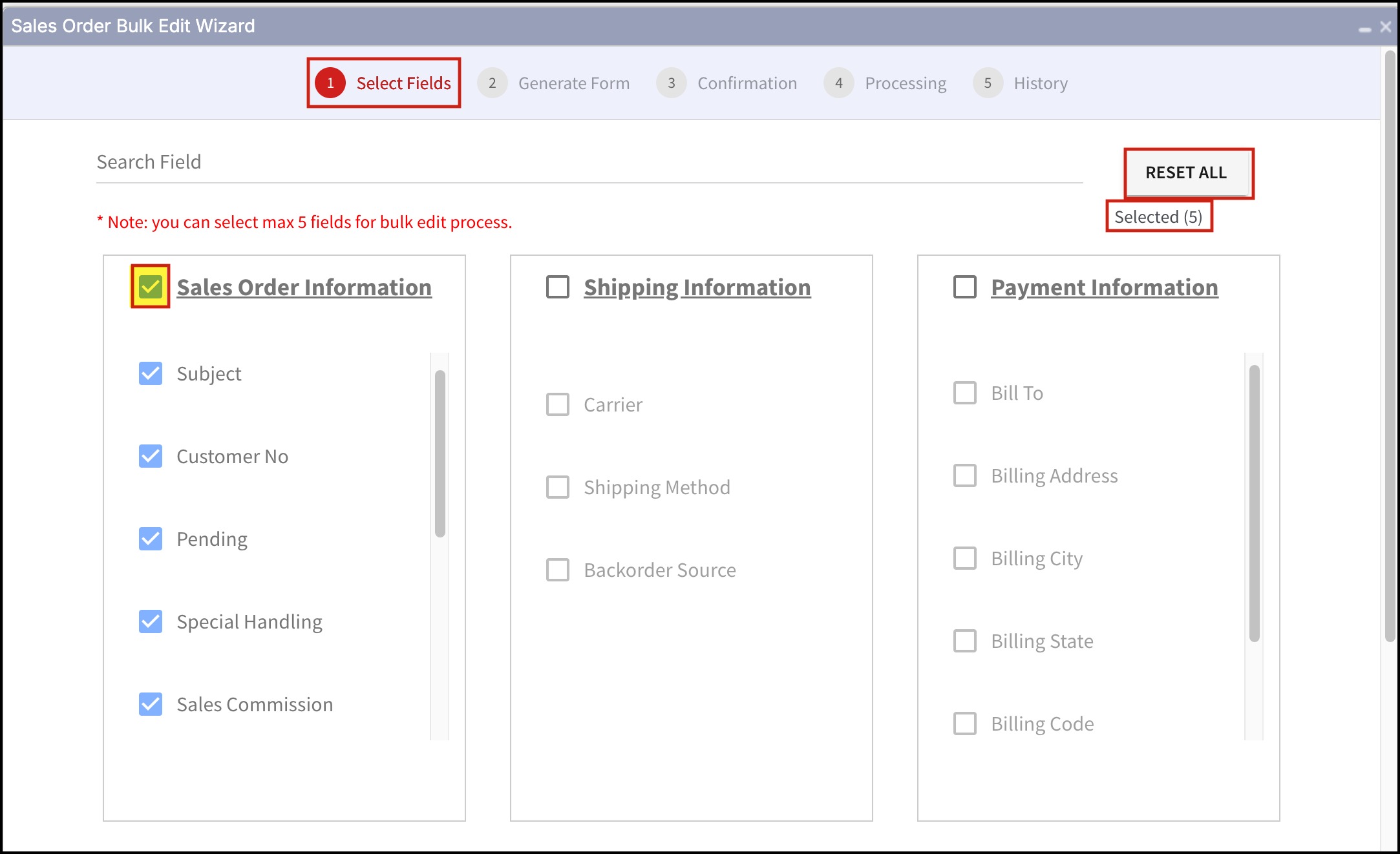 - Sales Order Bulk Edit Wizard will open where you can first see the 'Select Fields' window. Maximize the screen if needed.