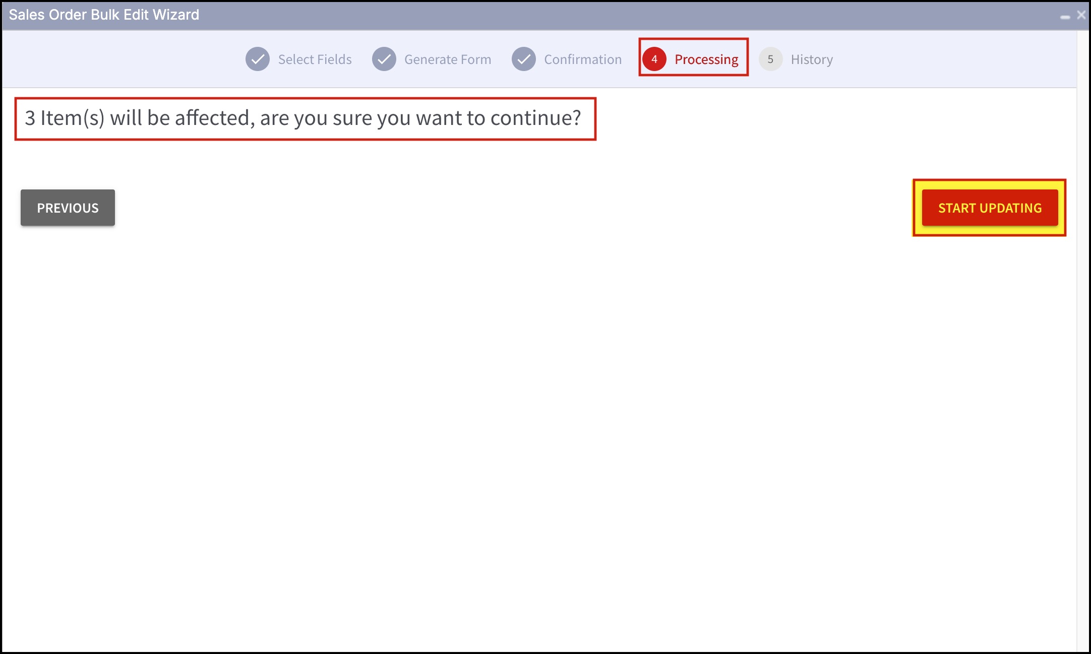- Then comes Processing. If you are sure to continue with the bulk edit, click on Start Updating.