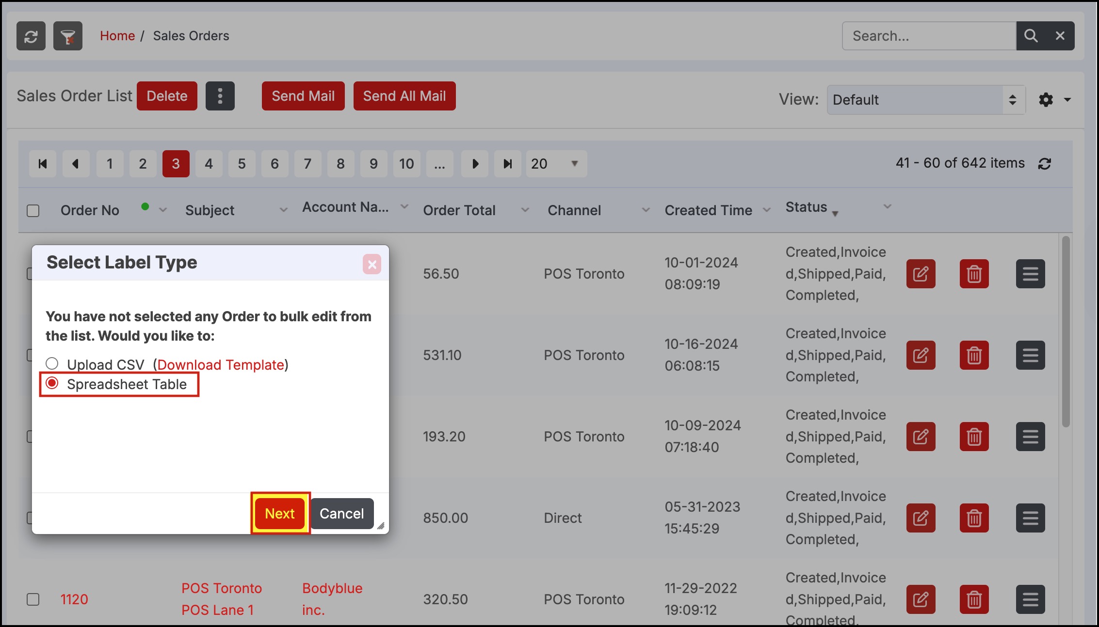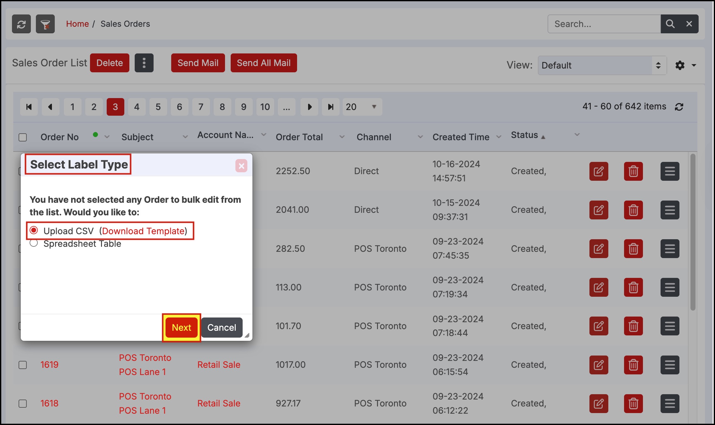 Select Label Type window will pop up with two options to upload sales orders for bulk edit - 'Upload CSV' or 'Spreadsheet Table'.