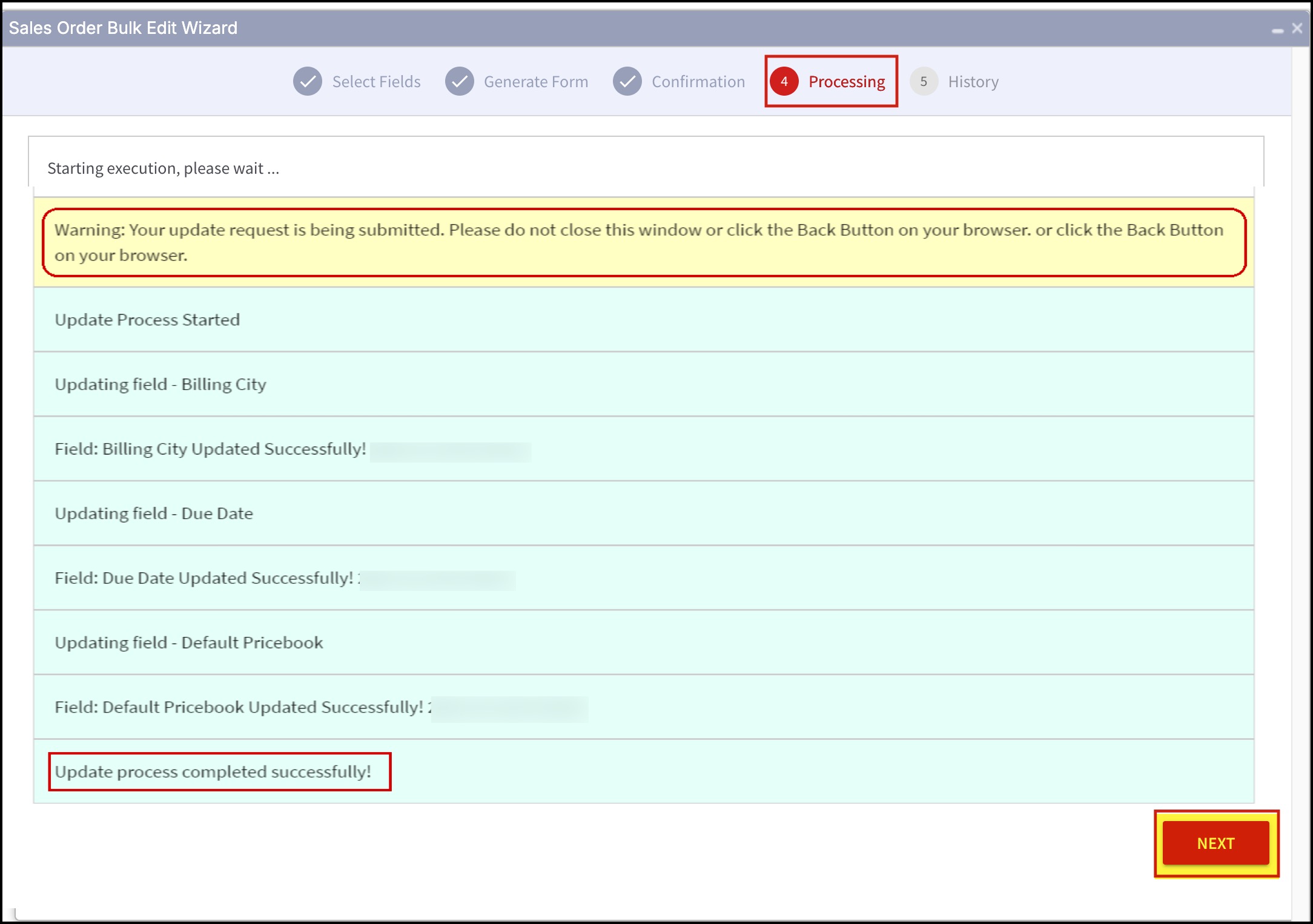 - You can see one by one updates of the fields. Just make sure you do not click the Back button on your browser or close the window, as the update takes place.