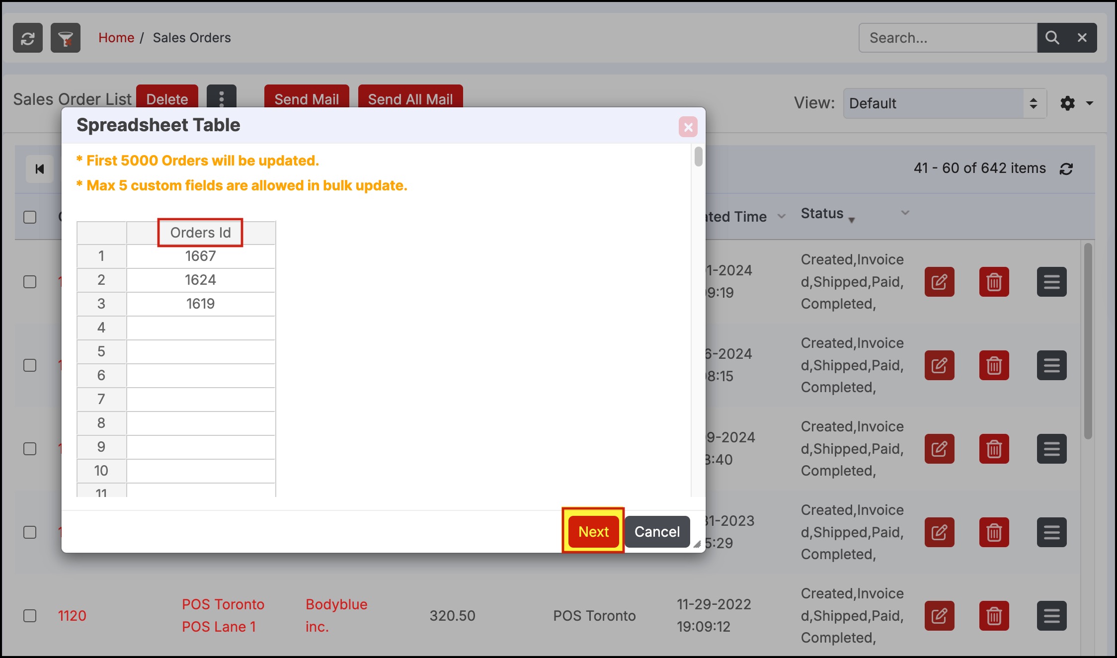 Directly, the spreadsheet table will open where you need to enter the Order Ids on which you want to perform bulk edit. Make sure to enter valid order ids.