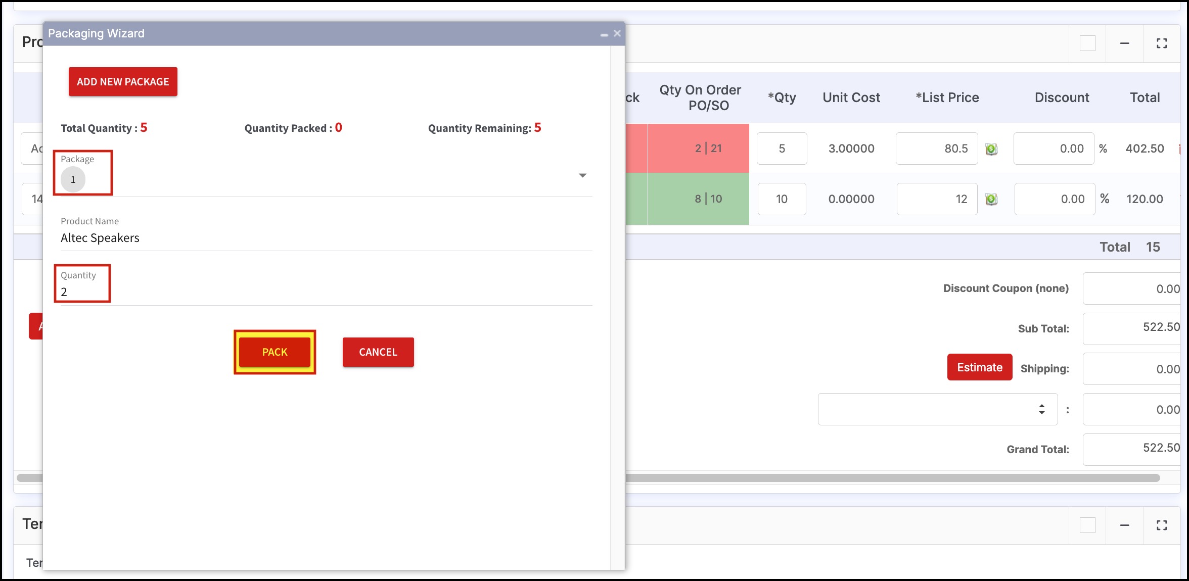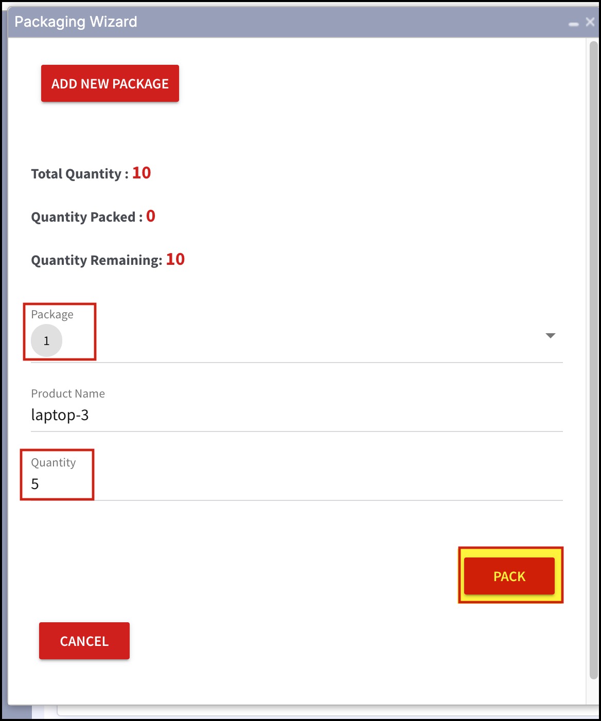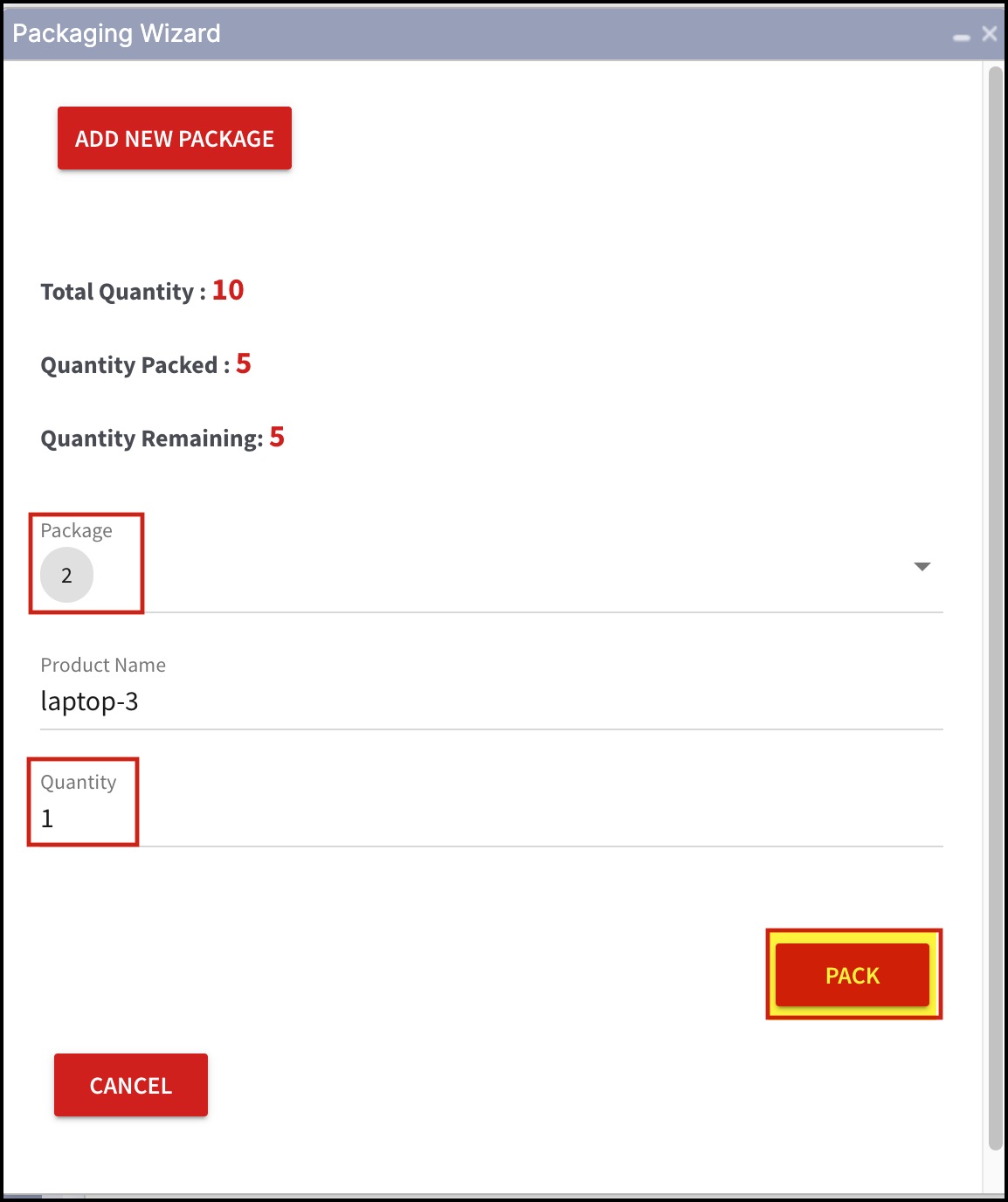 Since 2 quantities were packed out of the total 5 quantities, you can see the Quantity Packed count as 2 and the Quantity Remaining as 3.
