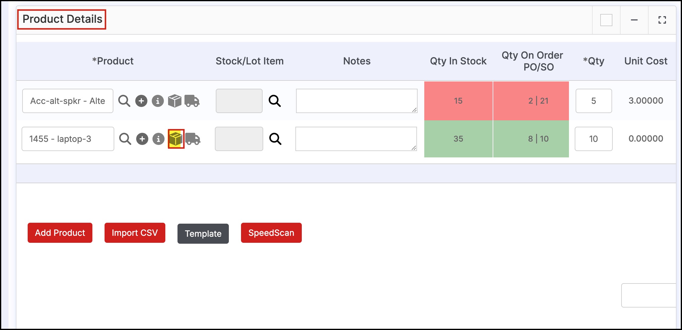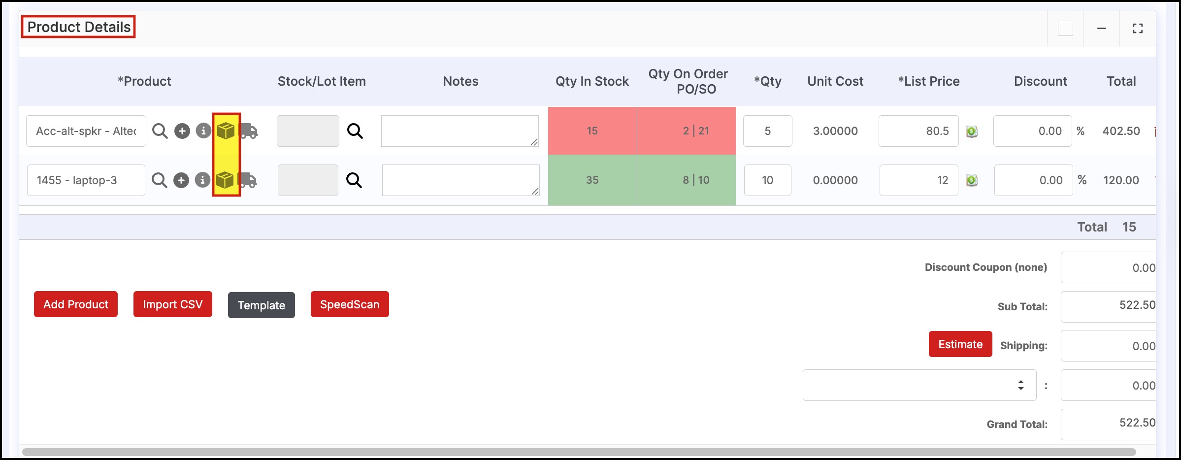 - Scroll down to the Product Details section. Here you can see the Package icon beside each line item.