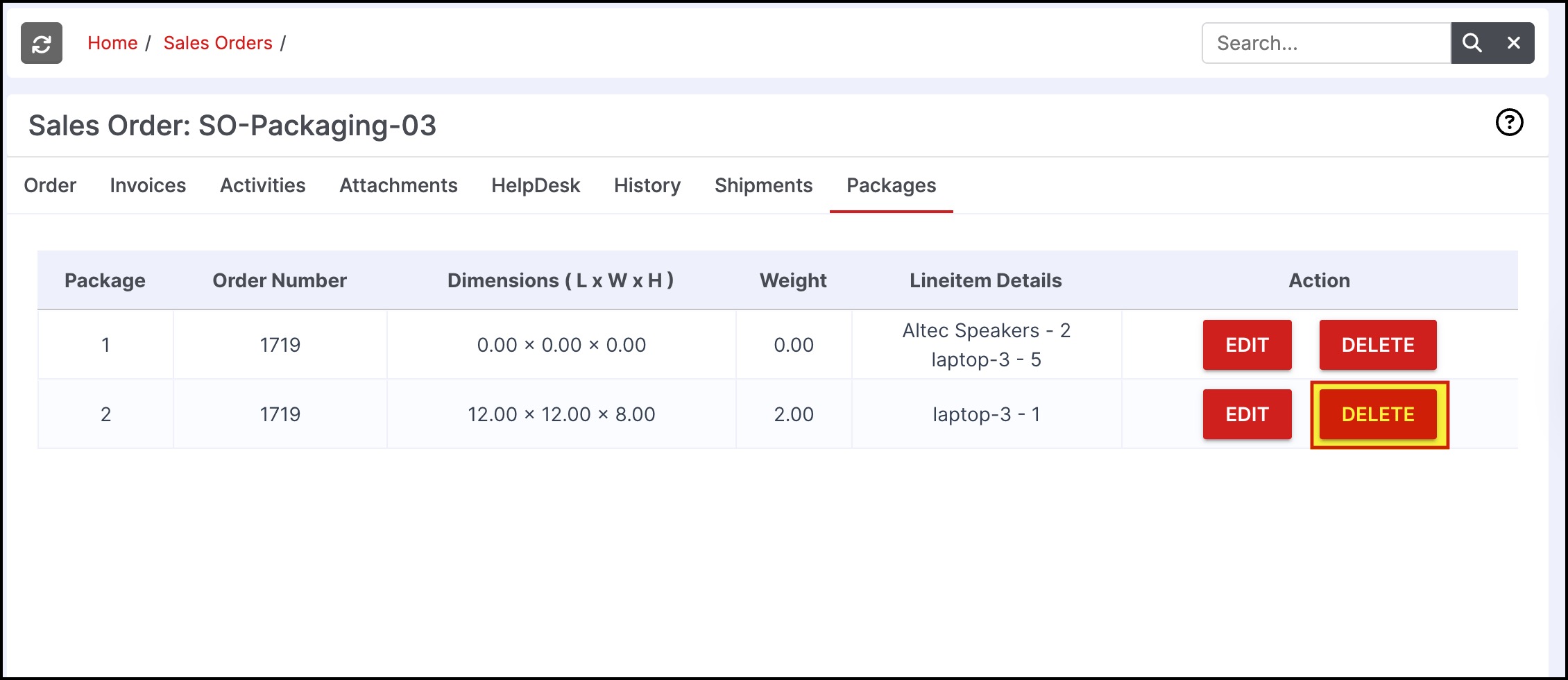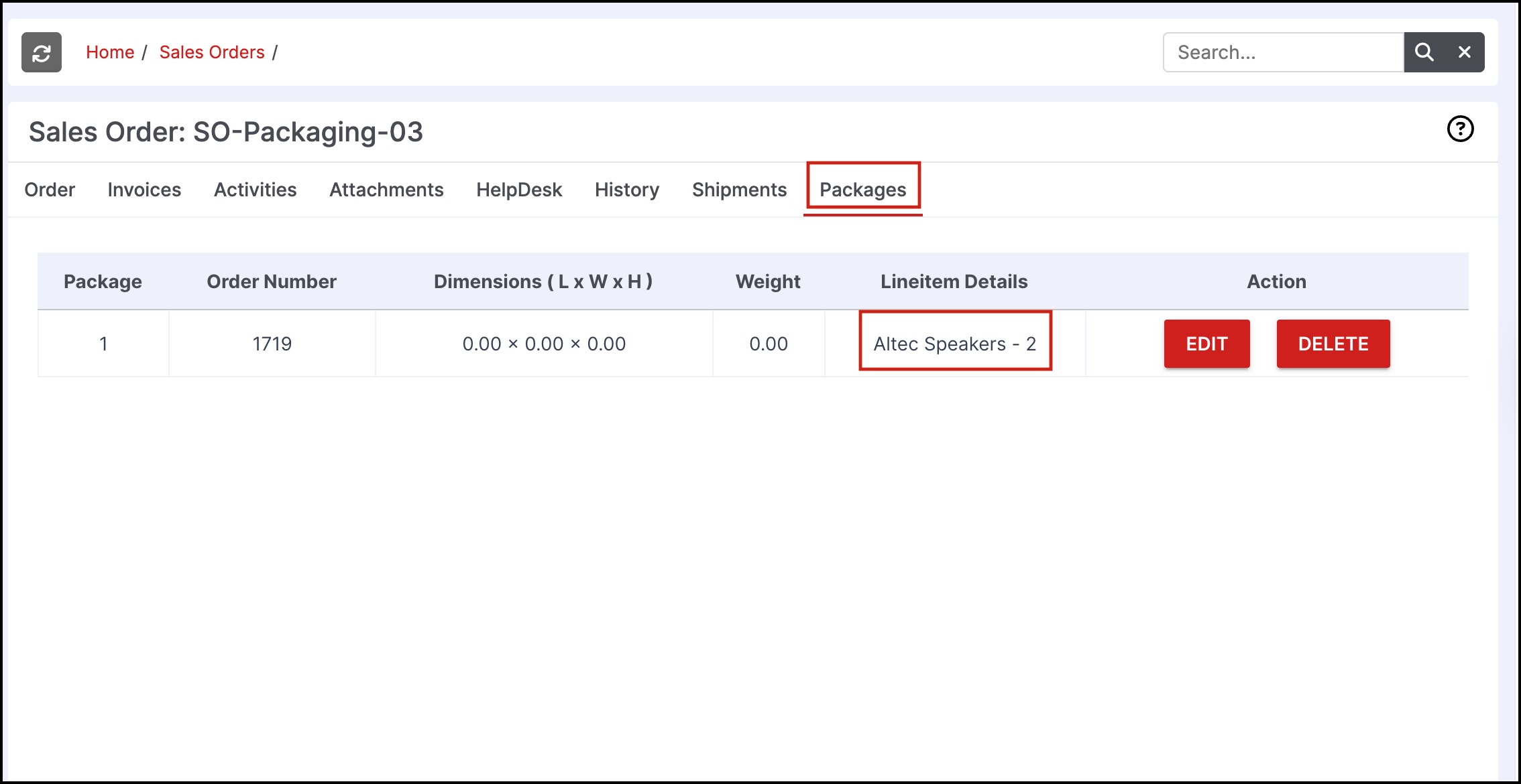 After the packaging process, once you save the Sales Order and go to the Packages tab, you can see the list of Packages created. The Line Item Details column displays the number of quantities packed and also the product names.