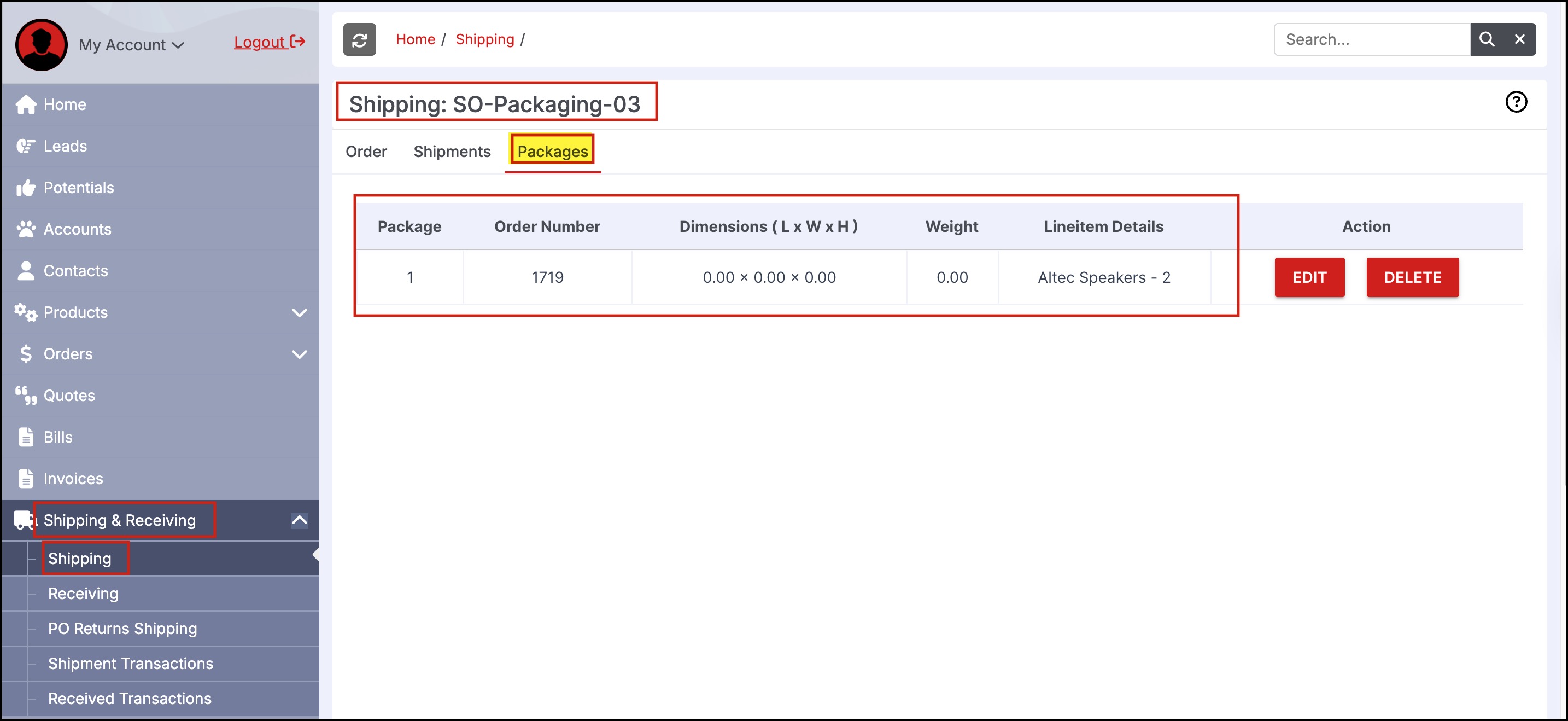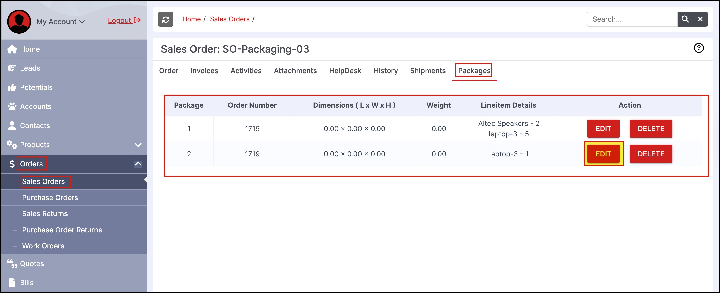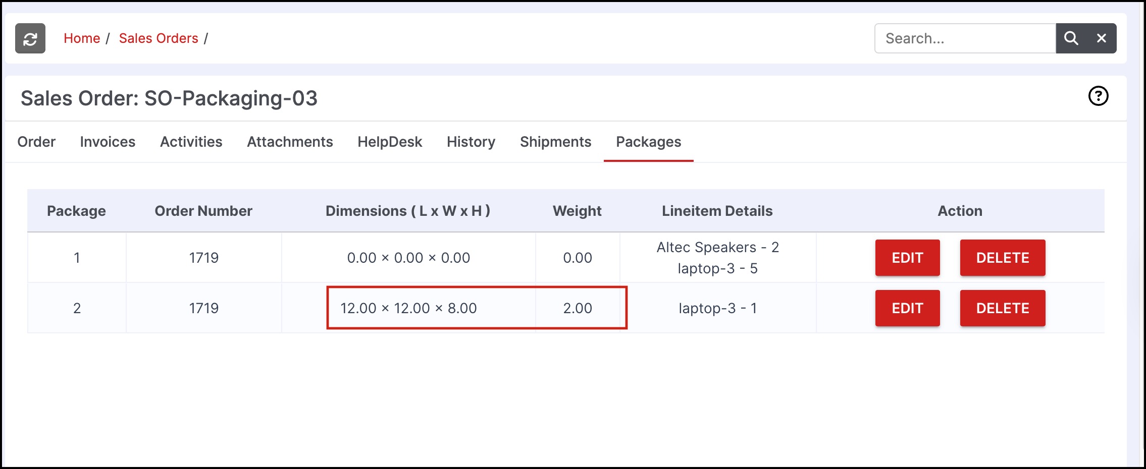 - Here you can click on the Edit button of the respective packages and set the Dimensions and Weight.
