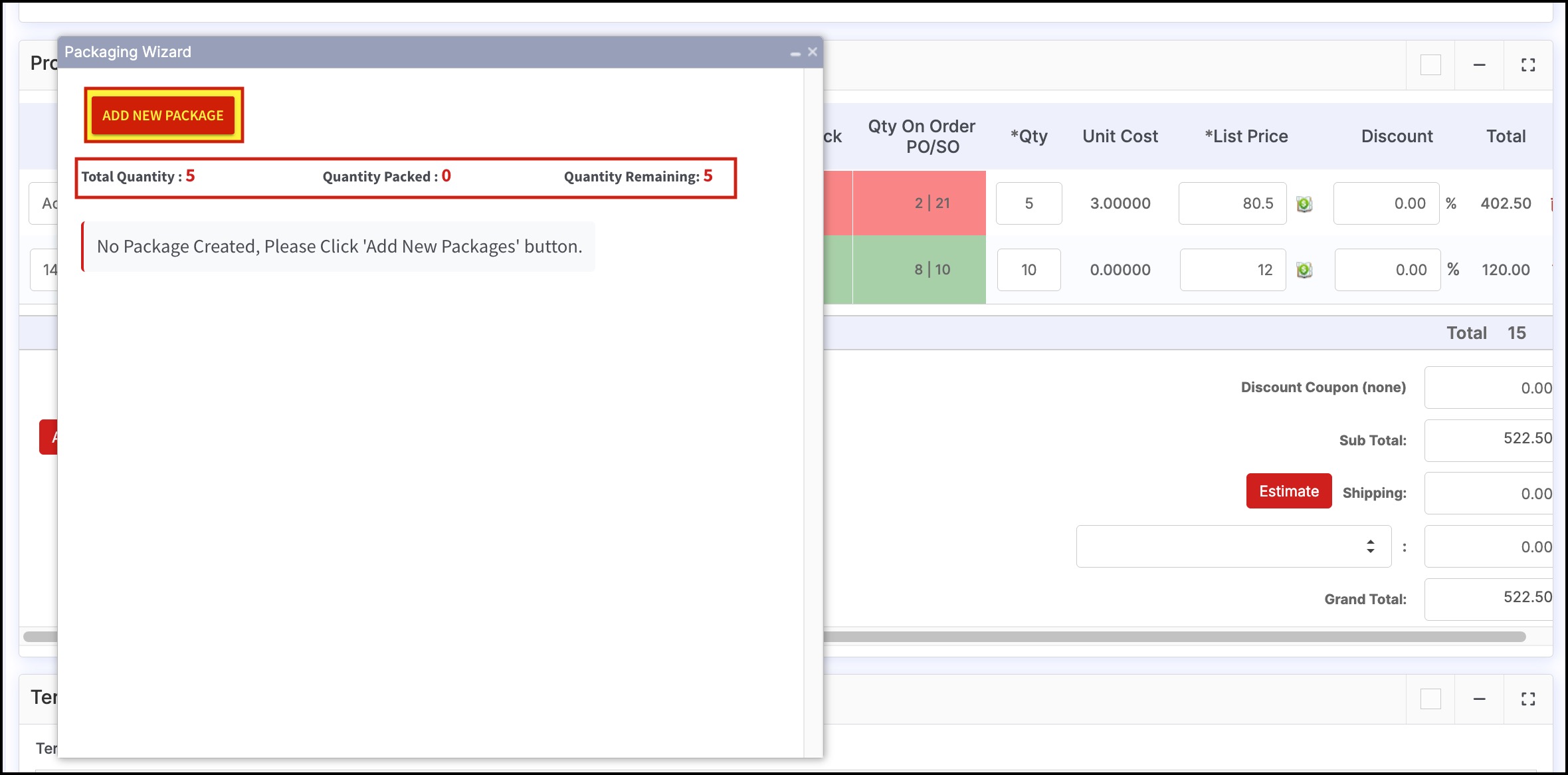 - Here you can see the Total Quantity, Quantity Packed, and Quantity Remaining. Since no package is created, there is no change in quantity.