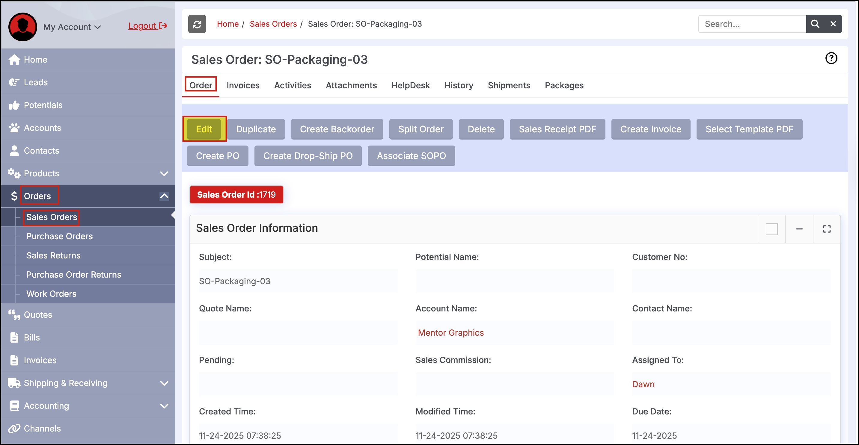 - If you want to delete a particular line item/line items from a package, go to the Order tab and then click on Edit and scroll down to the Product Details section.