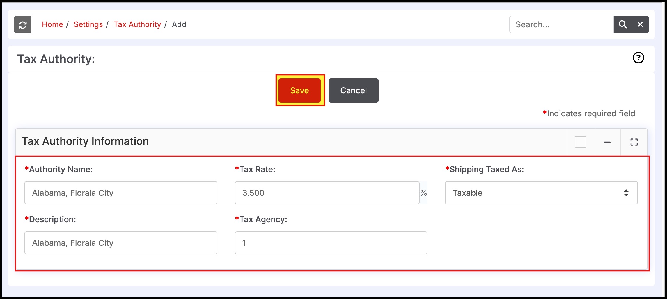 The fields available for each Tax Authority configuration is shown above. The "Shipping Taxed As" field should be set based on the tax rules for the jurisdiction covered by the Tax Authority. The three options available are: