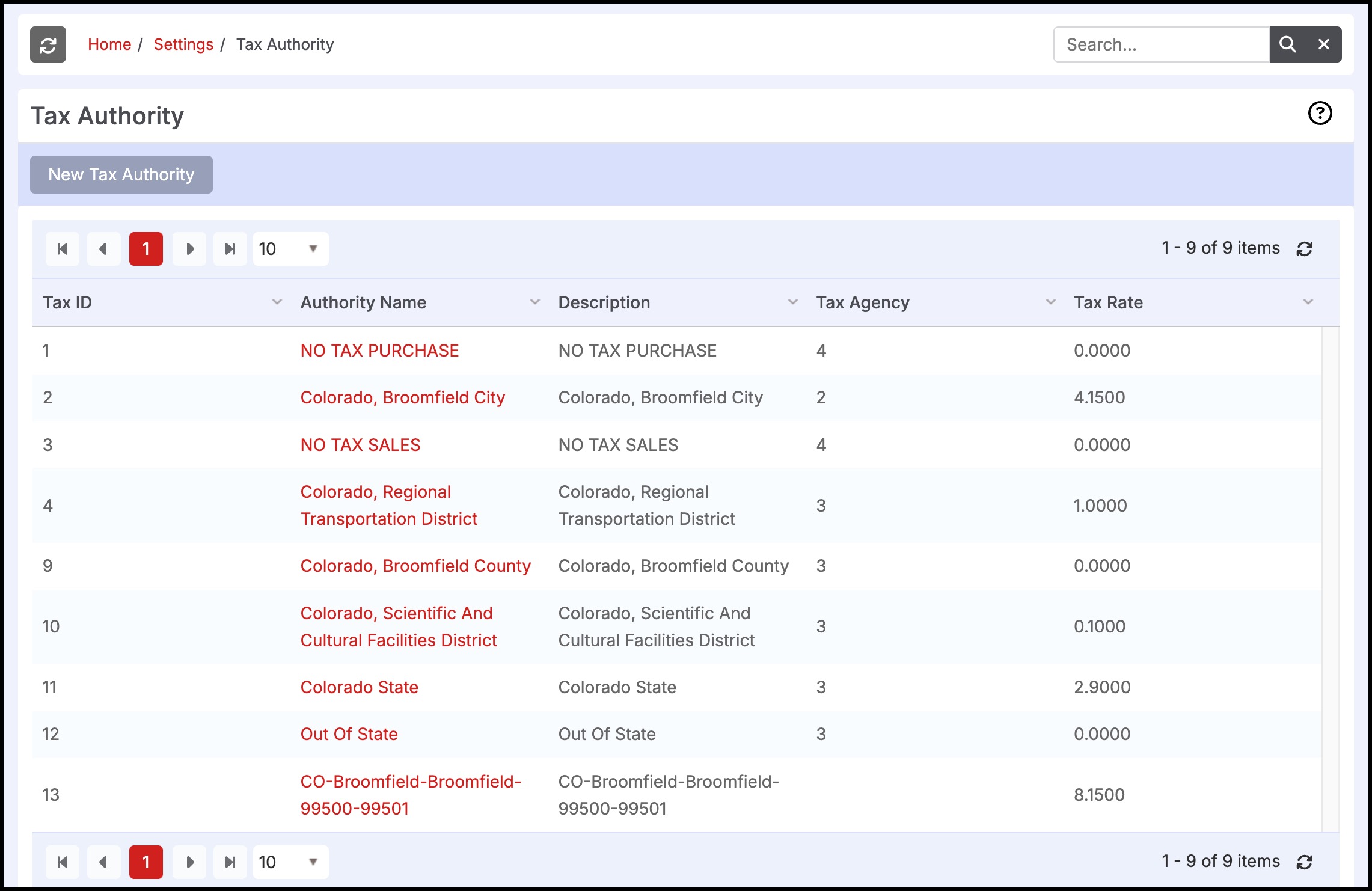 Note: If the user has imported item lists from QuickBooks, it is recommended that the user not make any changes to the imported tax authorities here to stay consistent and in sync with QuickBooks. It must also be noted that the QuickBooks only imports Tax items/agencies that are not set up in QuickBooks as Tax Groups.