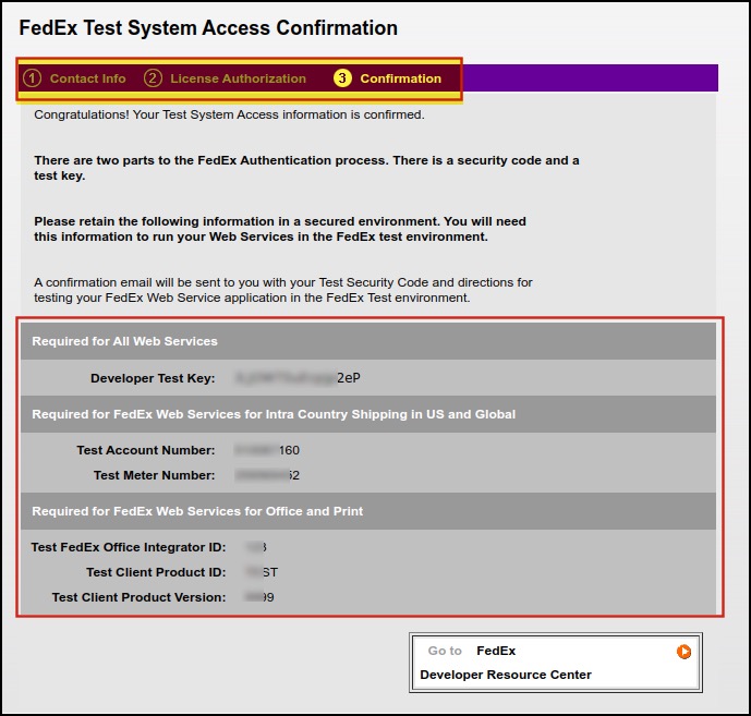 NOTE2 - FedEx sends a confirmation email with a Test Security Code and directions for testing your FedEx web service application in the FedEx Test environment.