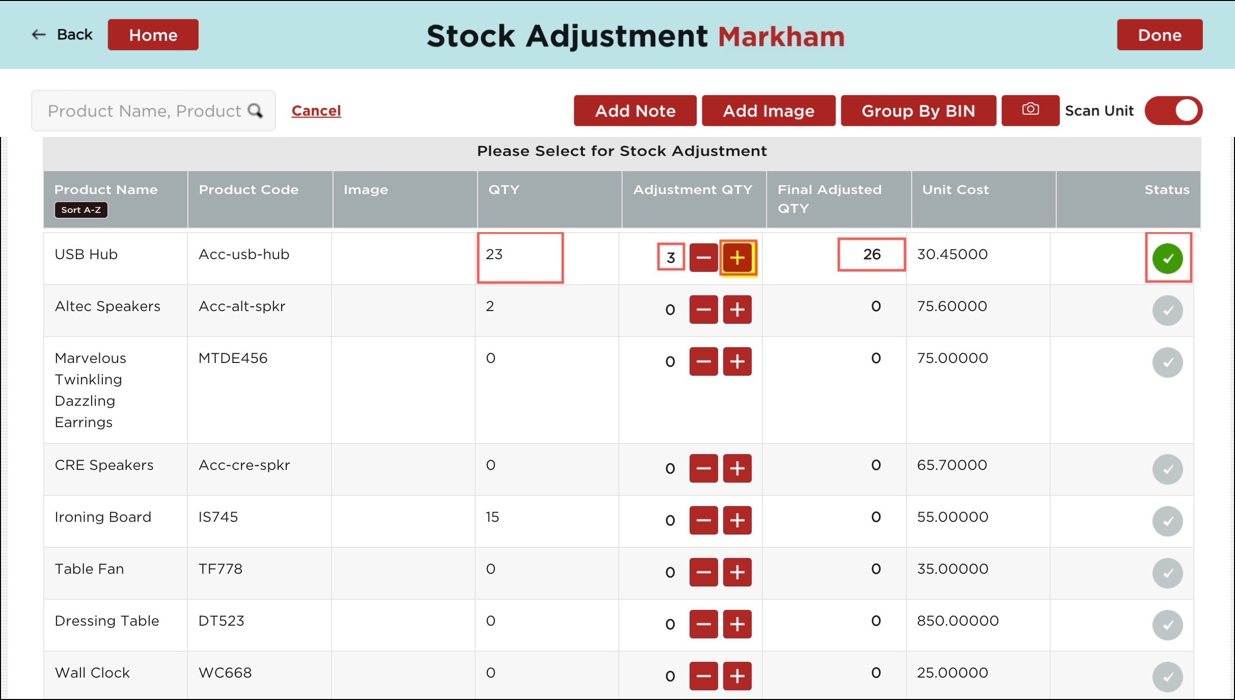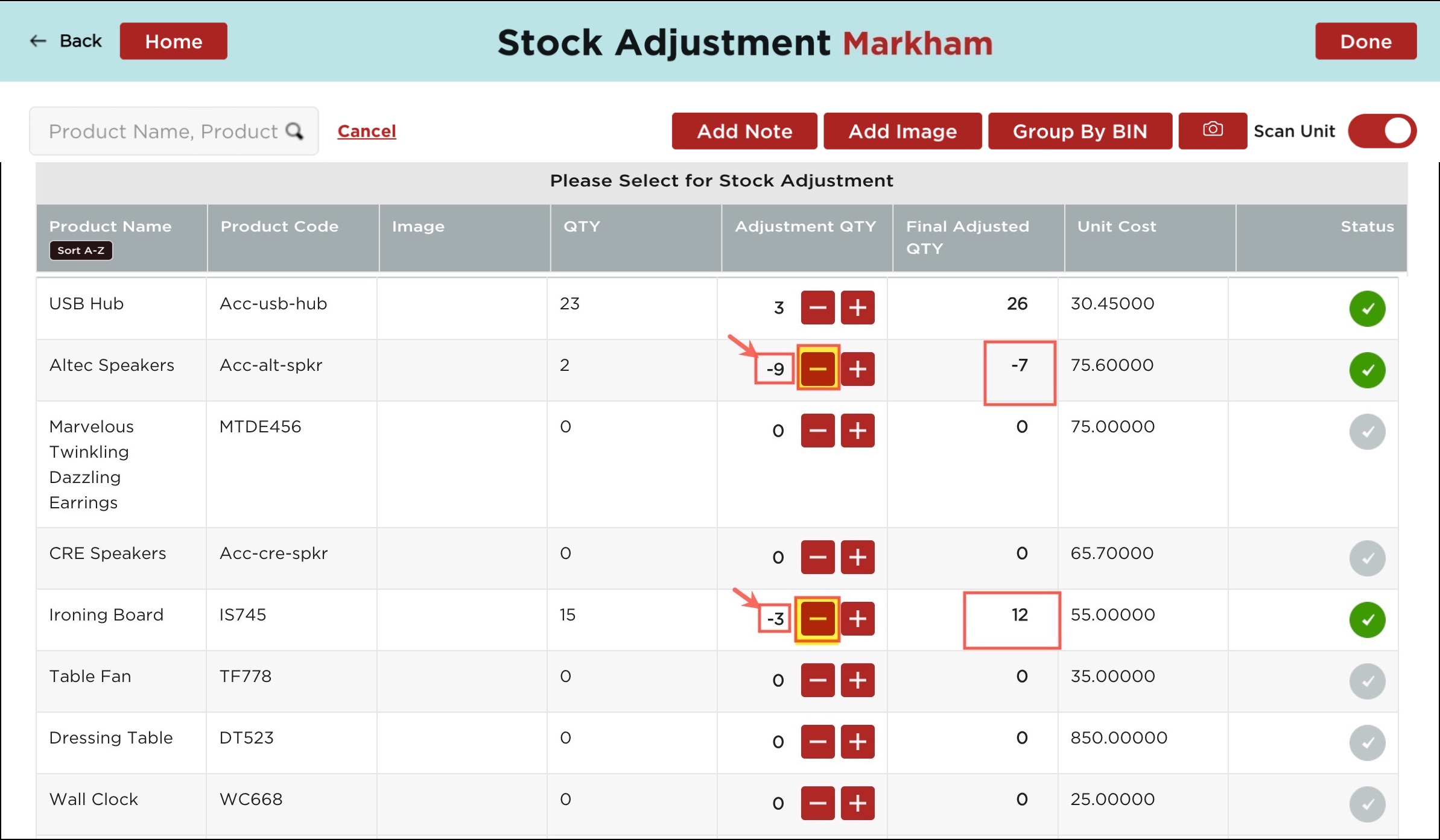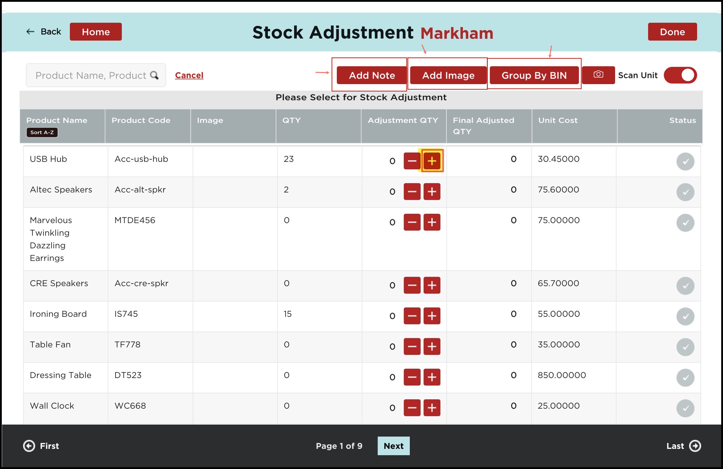 - If the scan unit is enabled for Stock Adjustment then you can see the "+" and "-" sign under the Adjustment Qty column (against each product) to modify the quantity up or down.