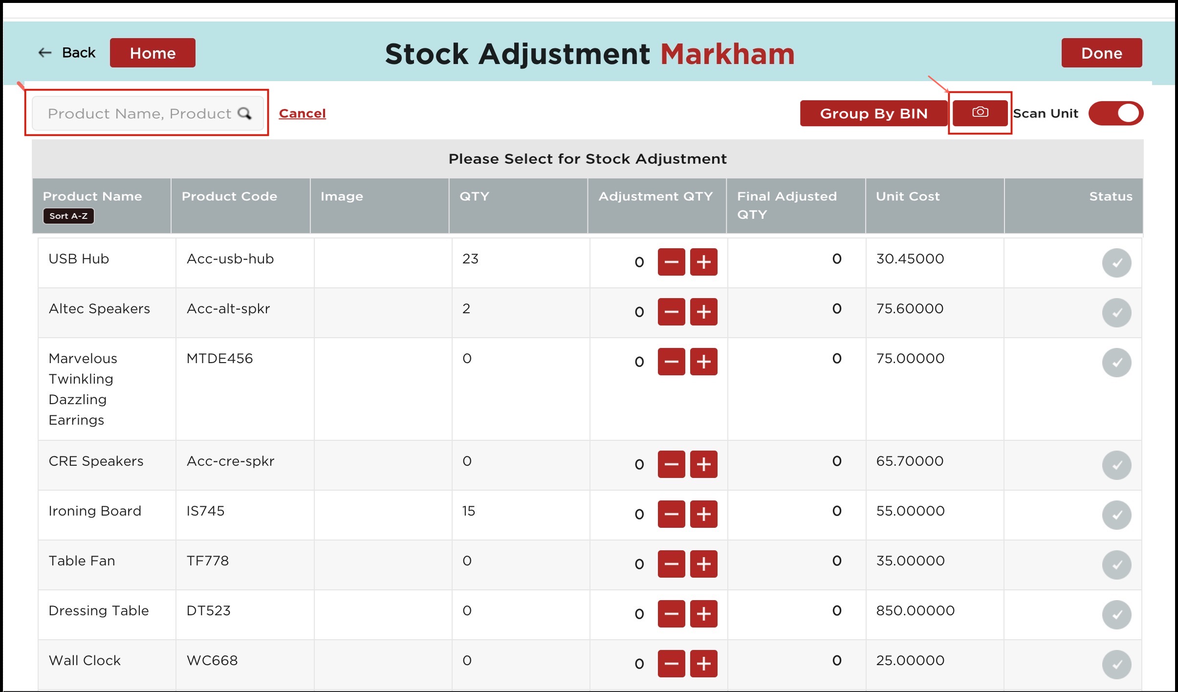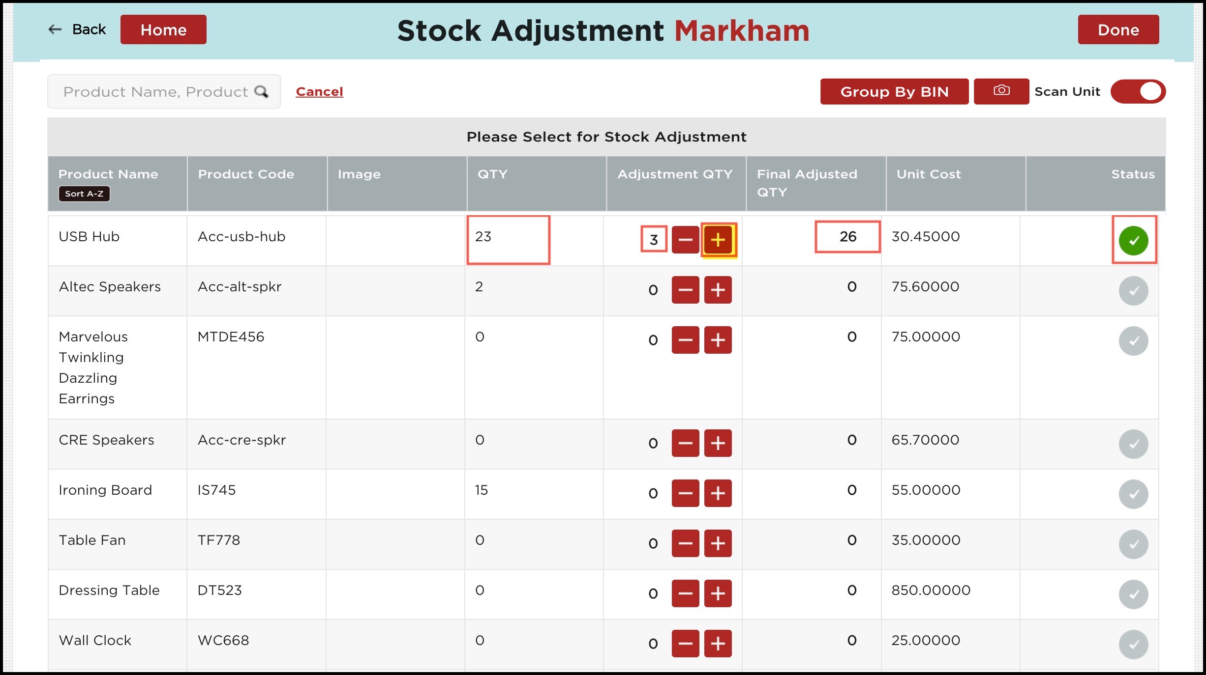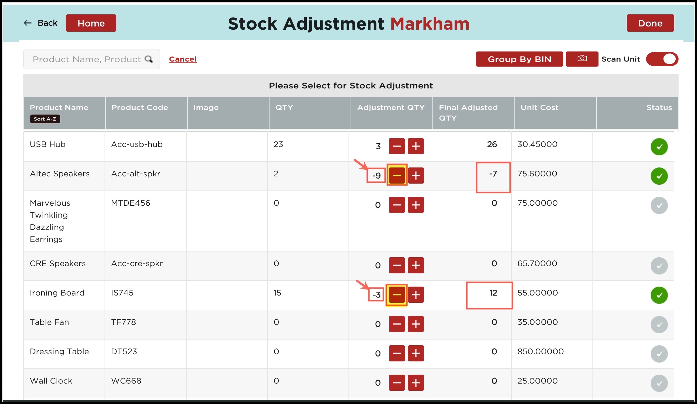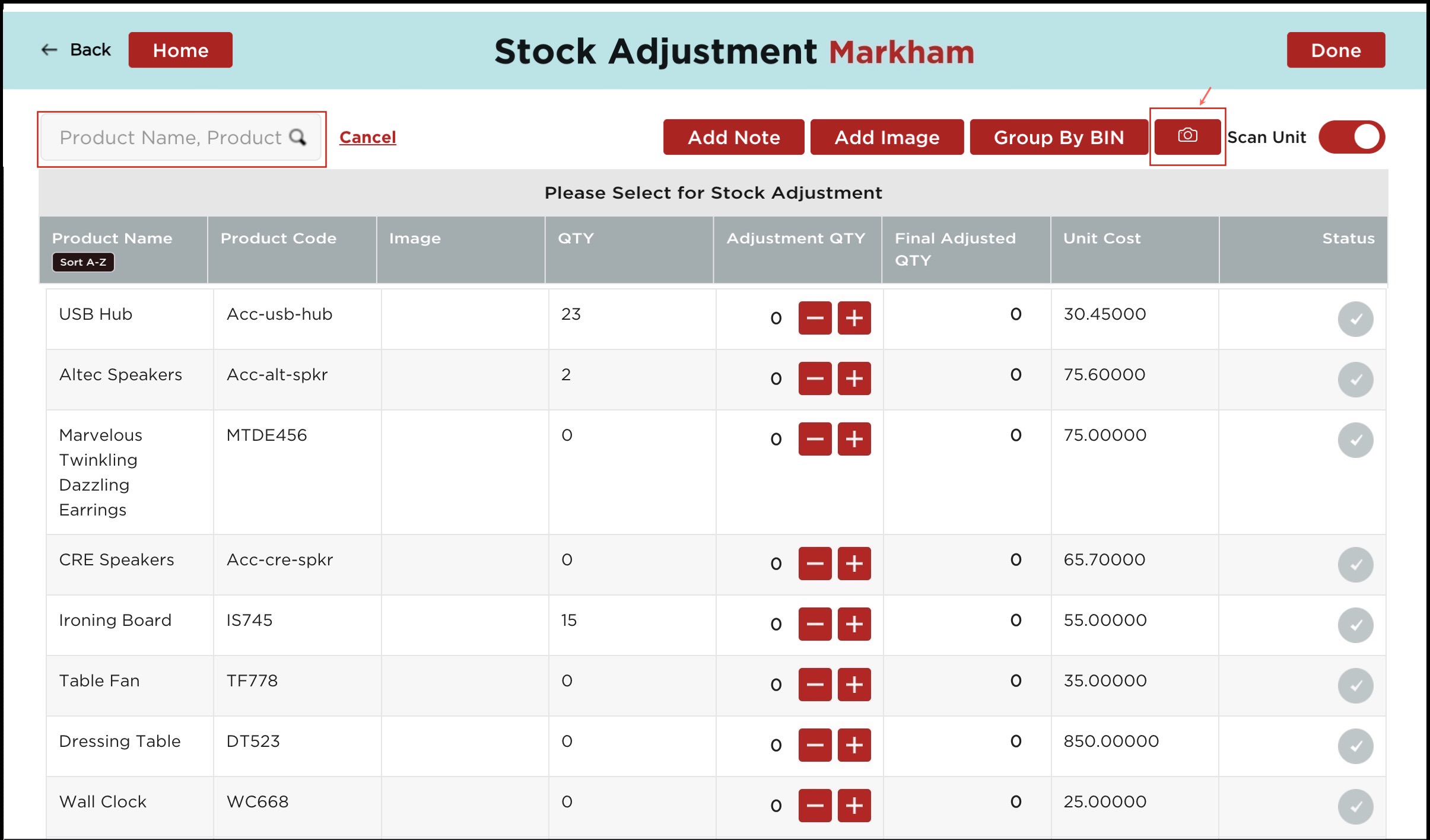 - If the scan unit is enabled for Stock Adjustment then you can see the "+" and "-" sign under the Adjustment Qty column (against each product) to modify the quantity up or down.