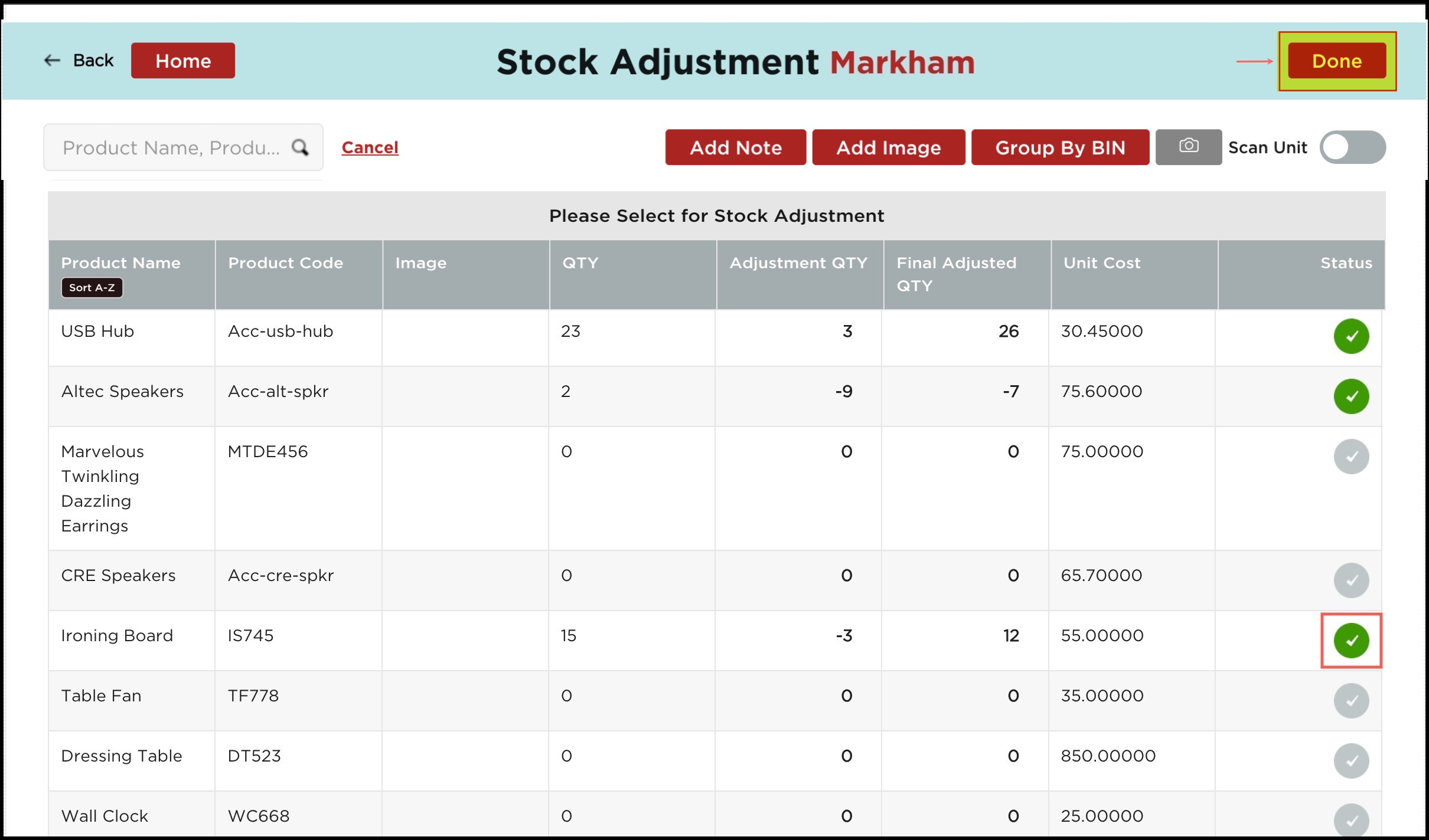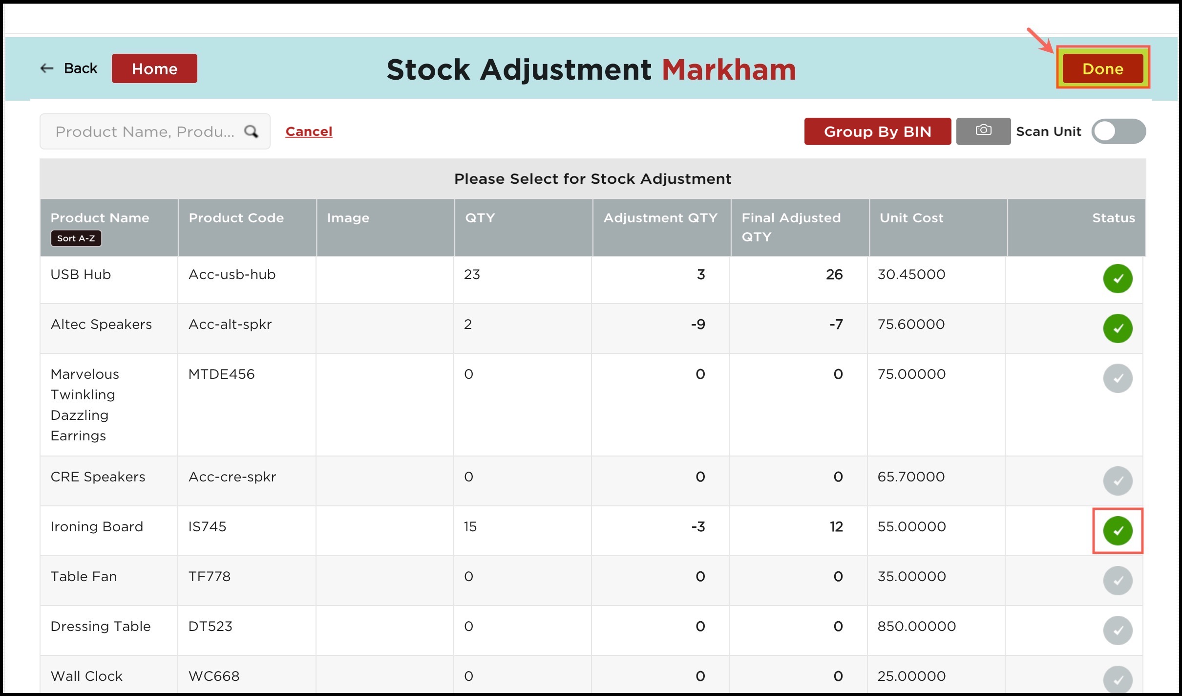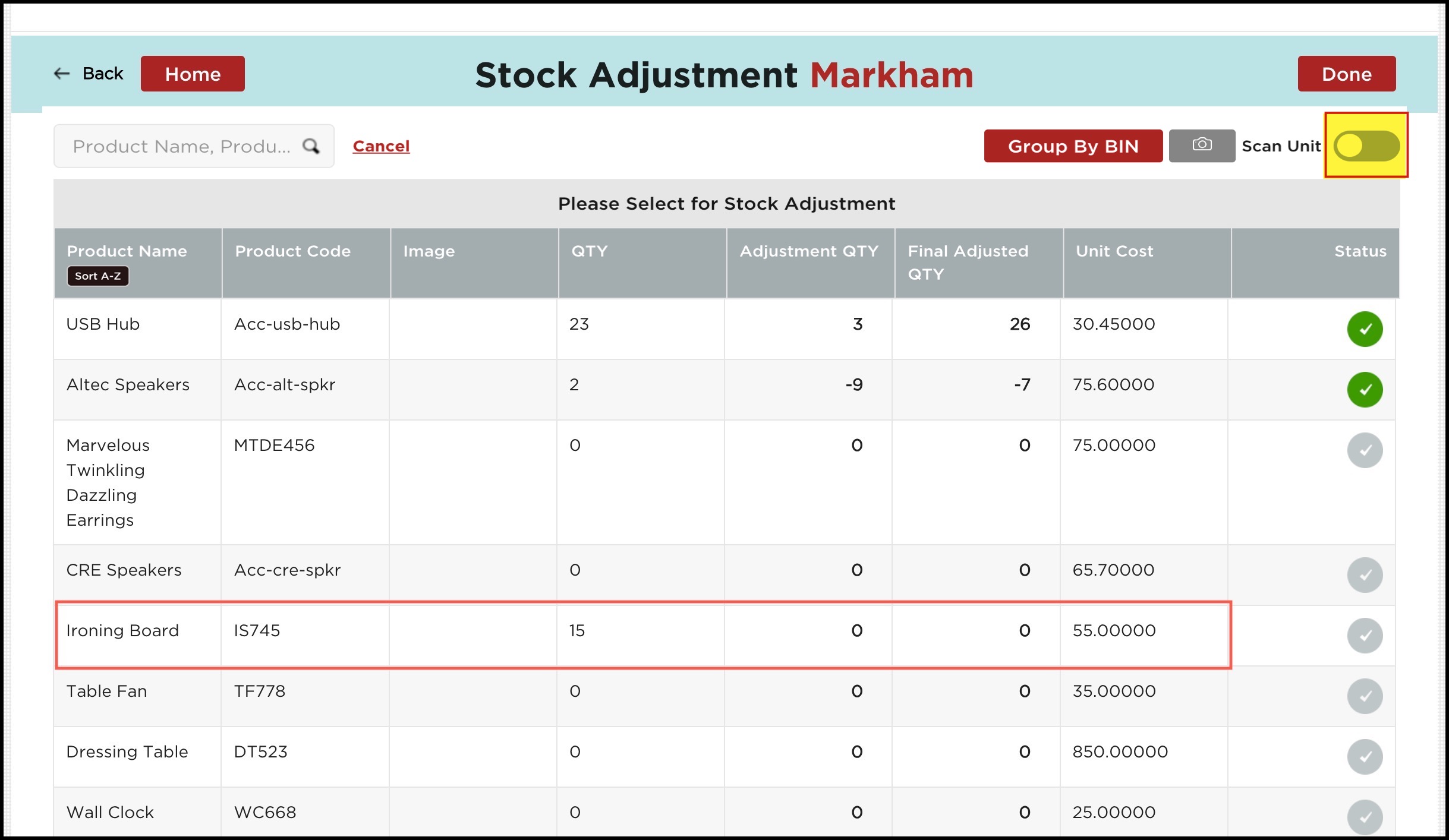 - If the scan unit is disabled, select the product for which you want to do the stock adjustment.