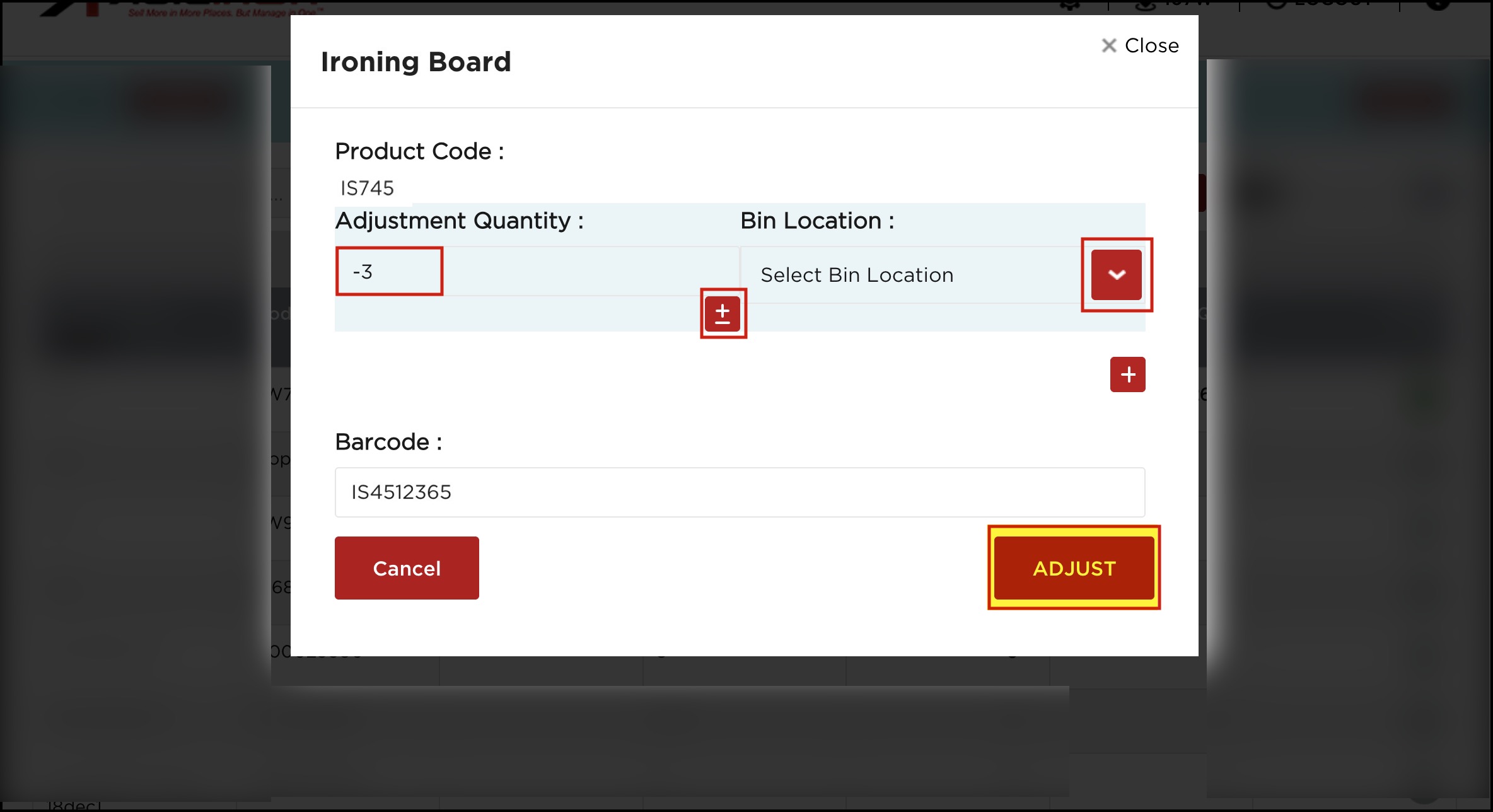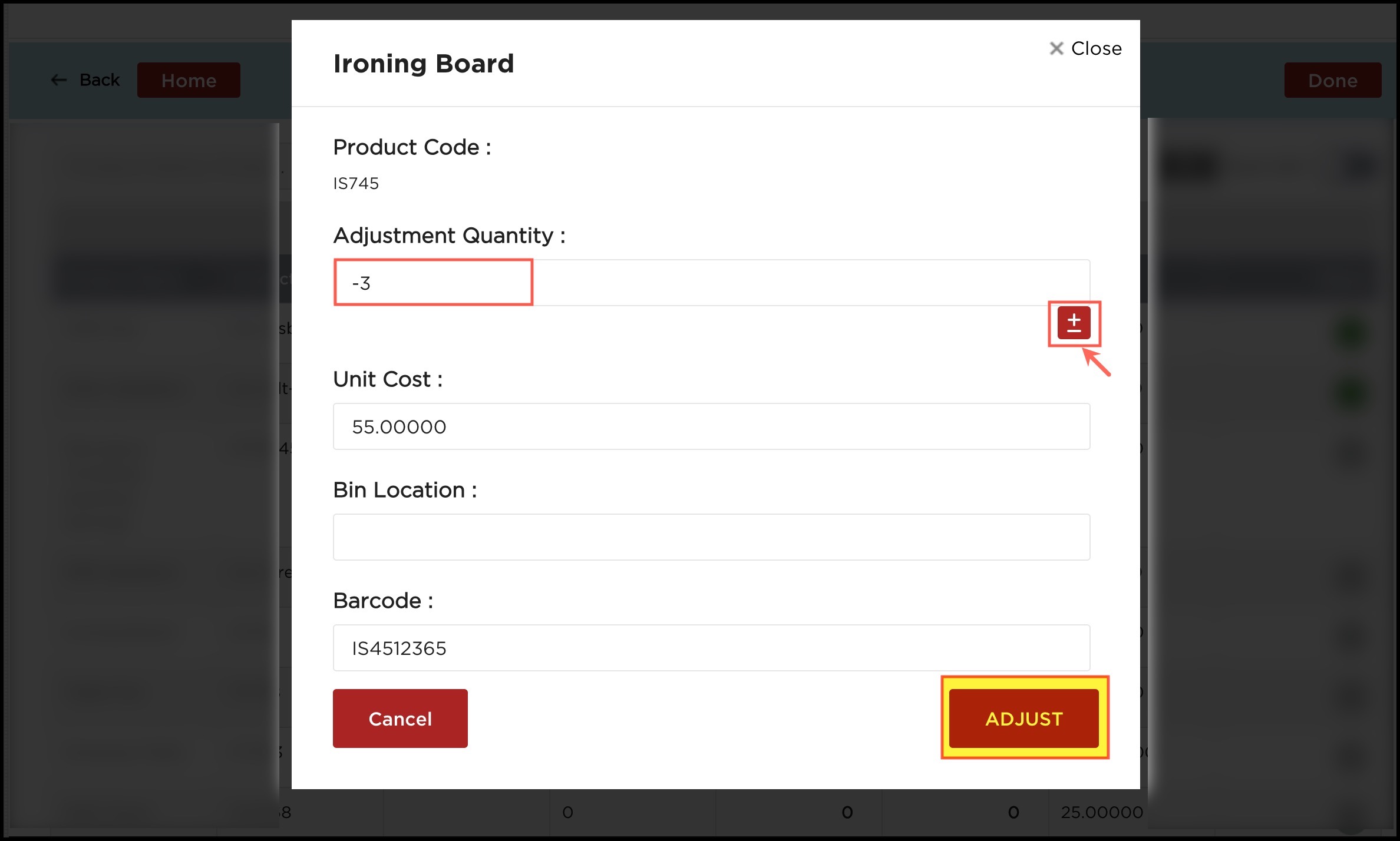 - If you want to modify the stock quantity down, then enter the adjustment quantity and click on the +/- button. Clicking this button should toggle between +ve and -ve if the “Adjustment Qty” is non-zero.