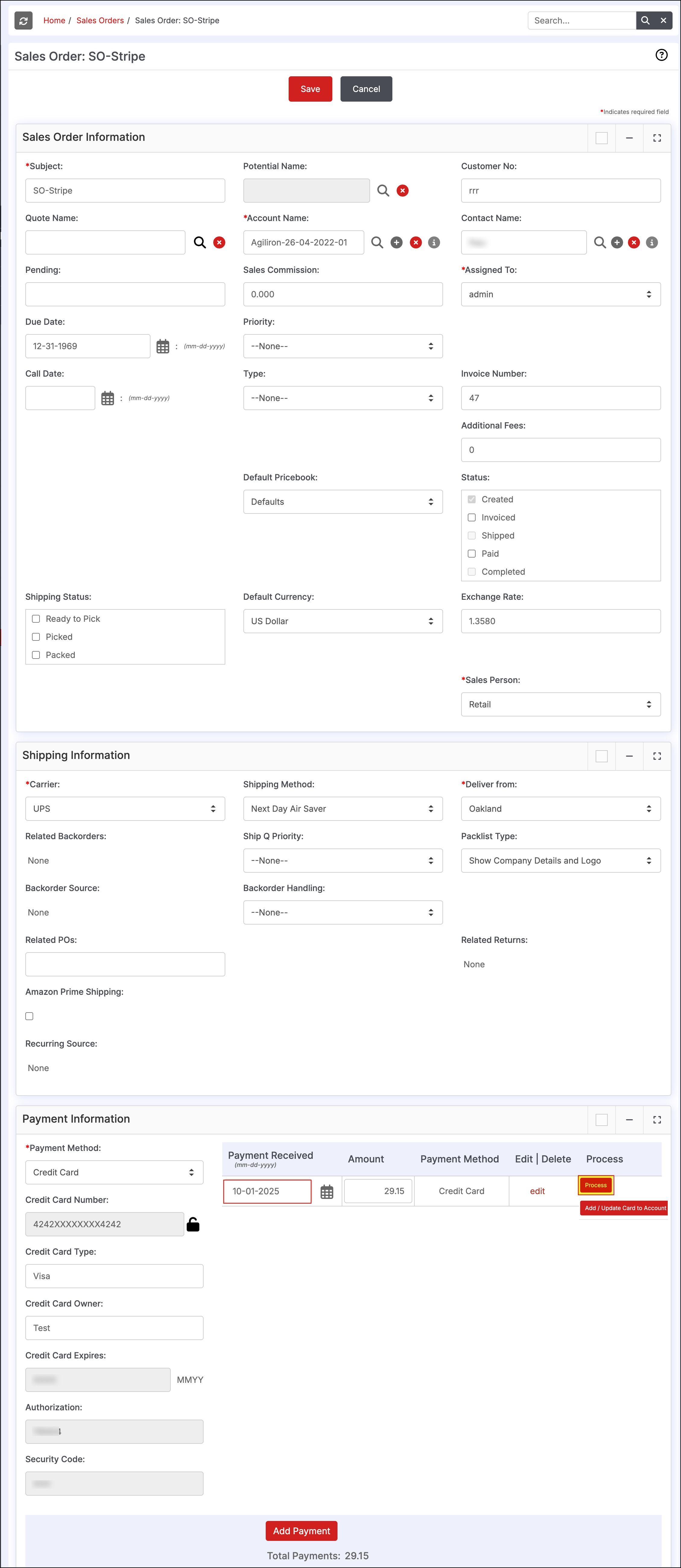 - Now when you create any Sales Order and process payment via Credit Card or any selected payment method (in Stripe)