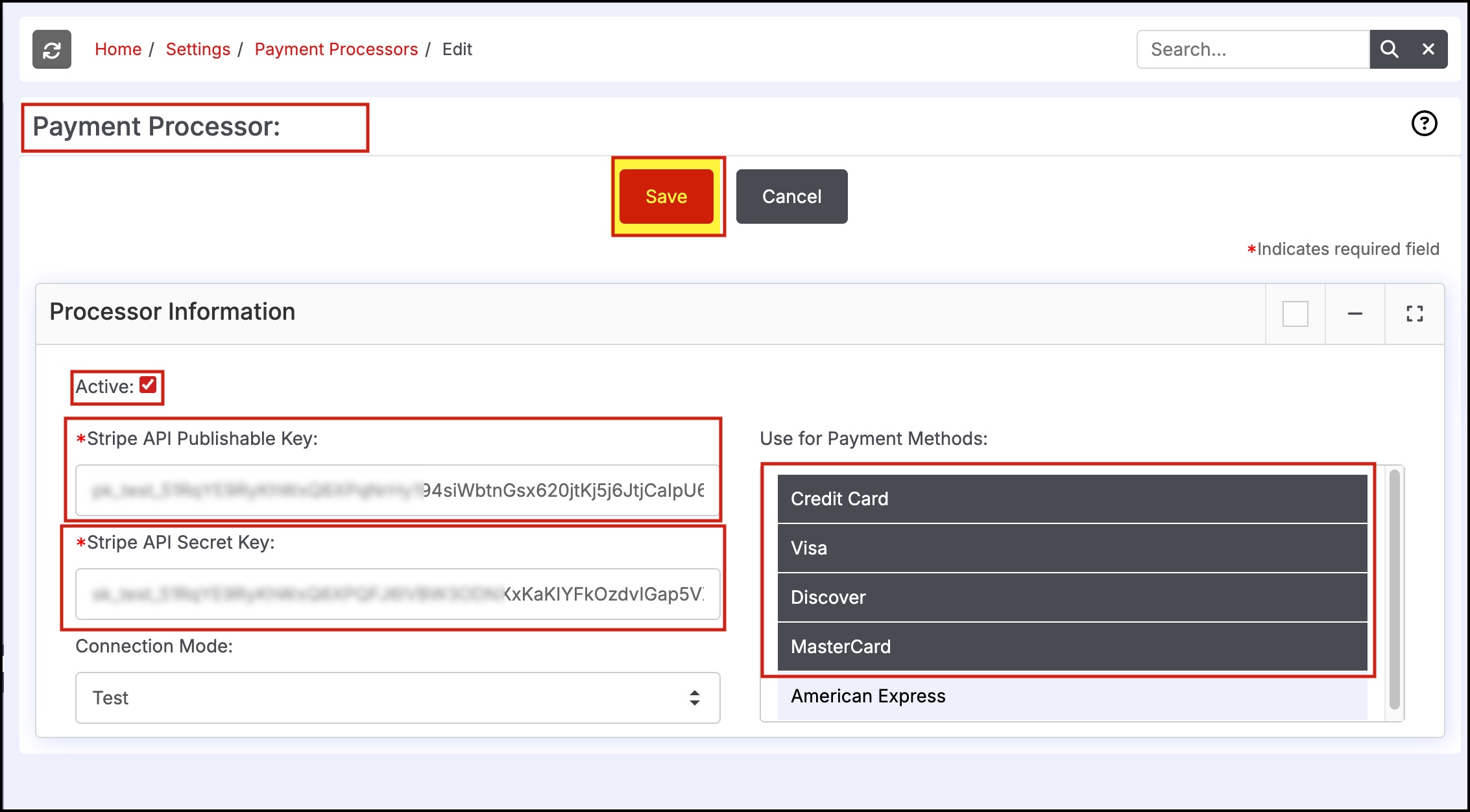 - Now paste the API keys, copied from the Stripe account dashboard, click on Active checkbox