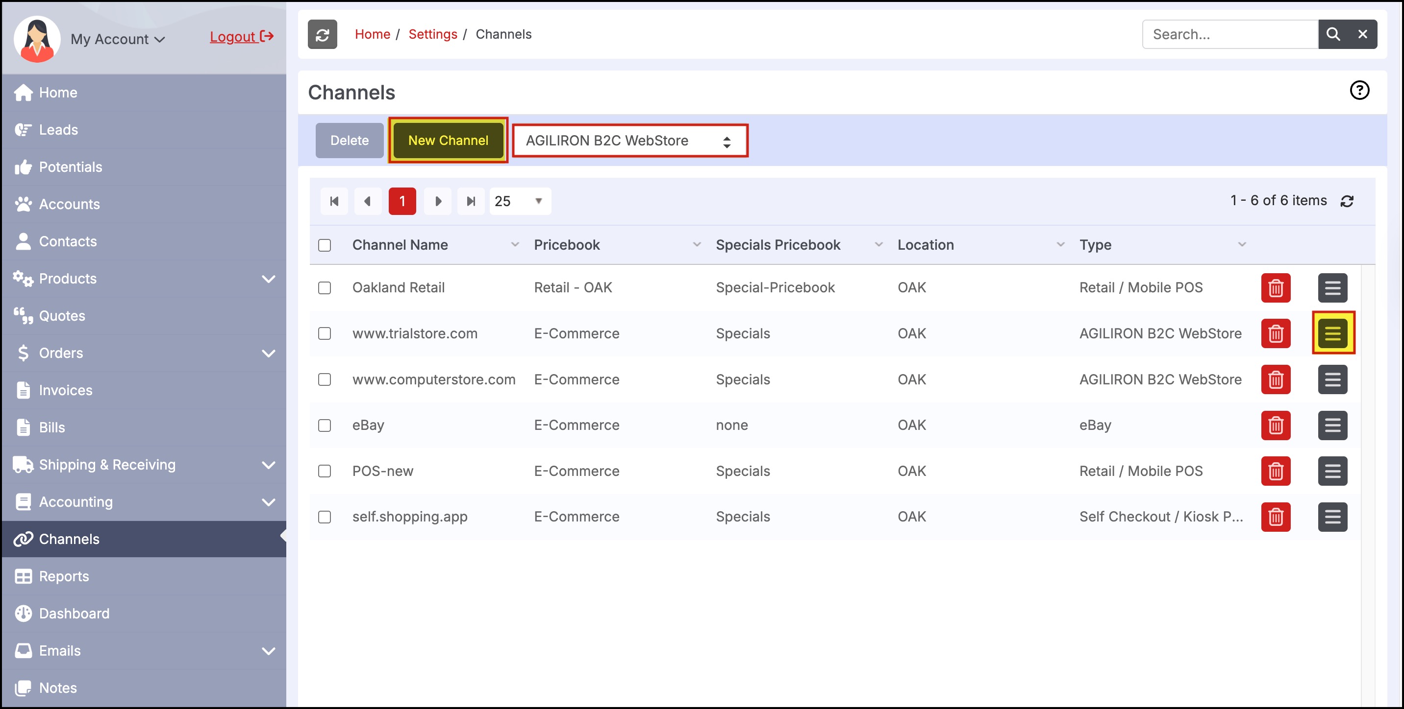 - Either create a new channel or edit the existing store as per your requirement. Here, as an example, we are setting up the Stripe payment processor for an existing B2C web store by clicking the Edit icon.