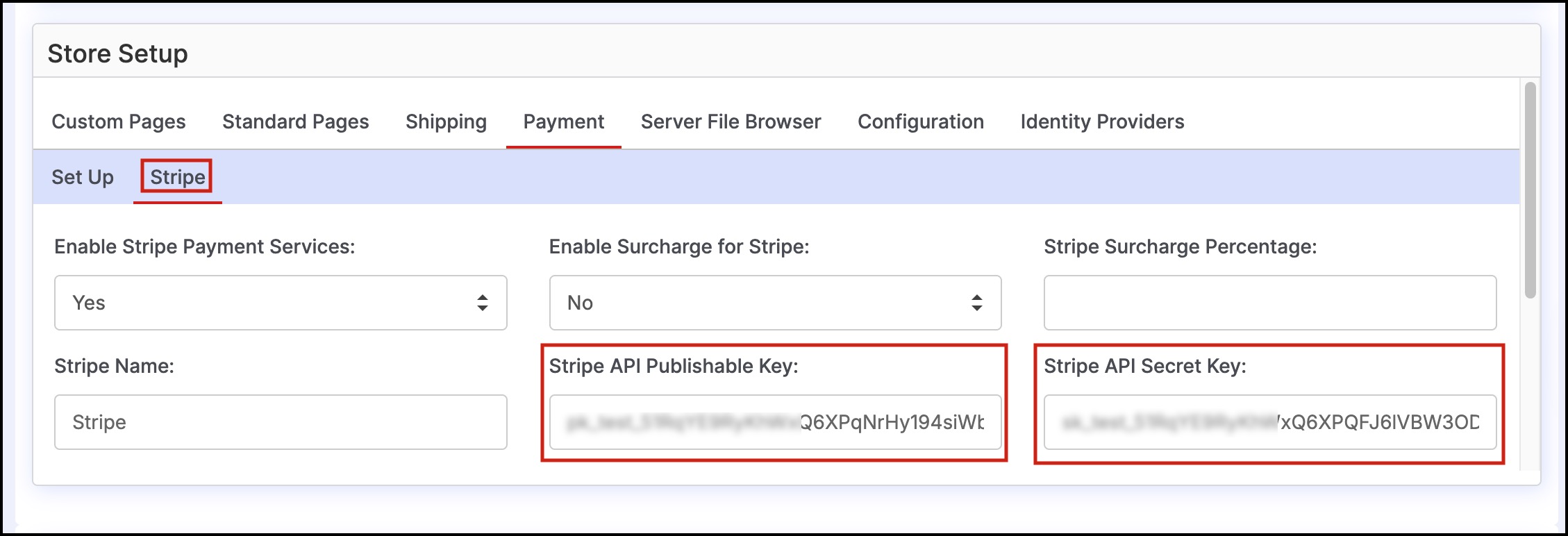 - In the Stripe tab, paste the Stripe API publishable key and Secret key to establish connection with the webstore account. (Refer to Stripe Payment Processor for API keys info)