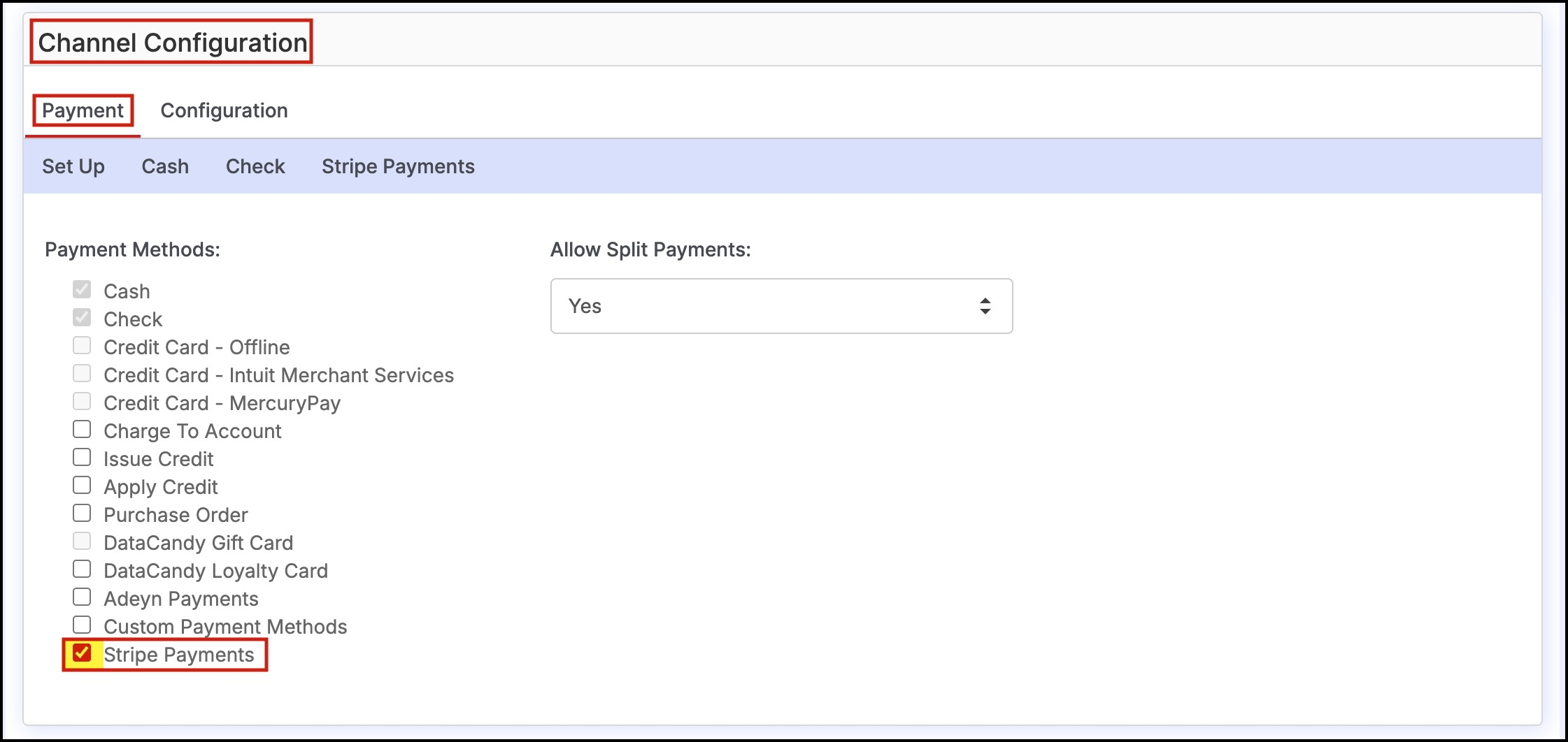 - Verify that Stripe Payments is selected as a payment processor on the "Payment" tab.