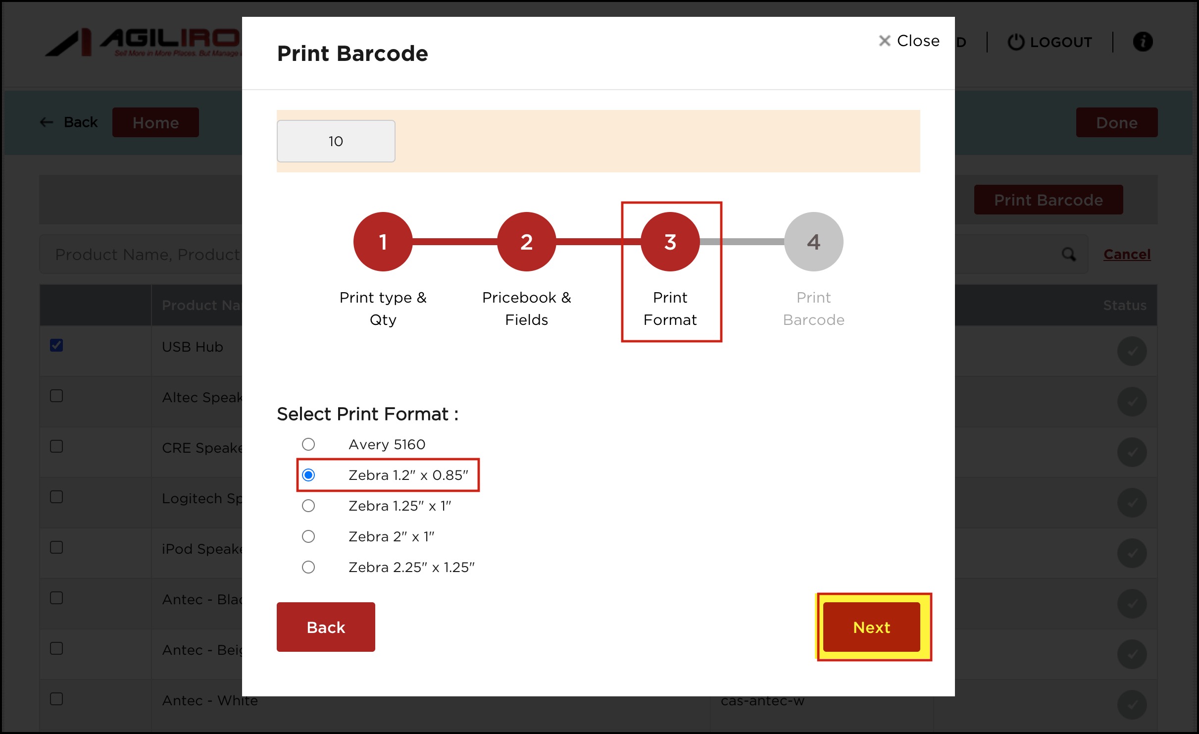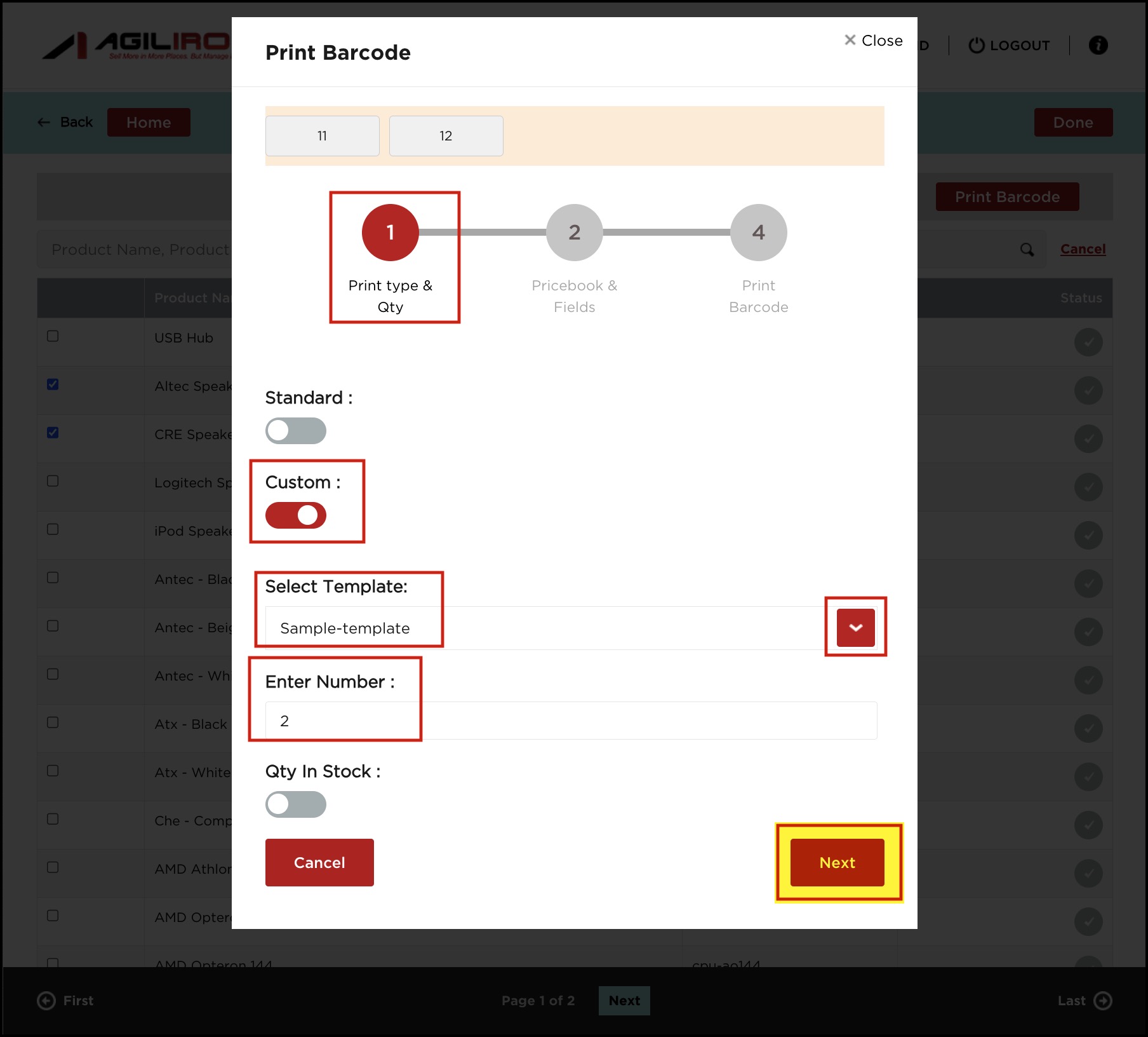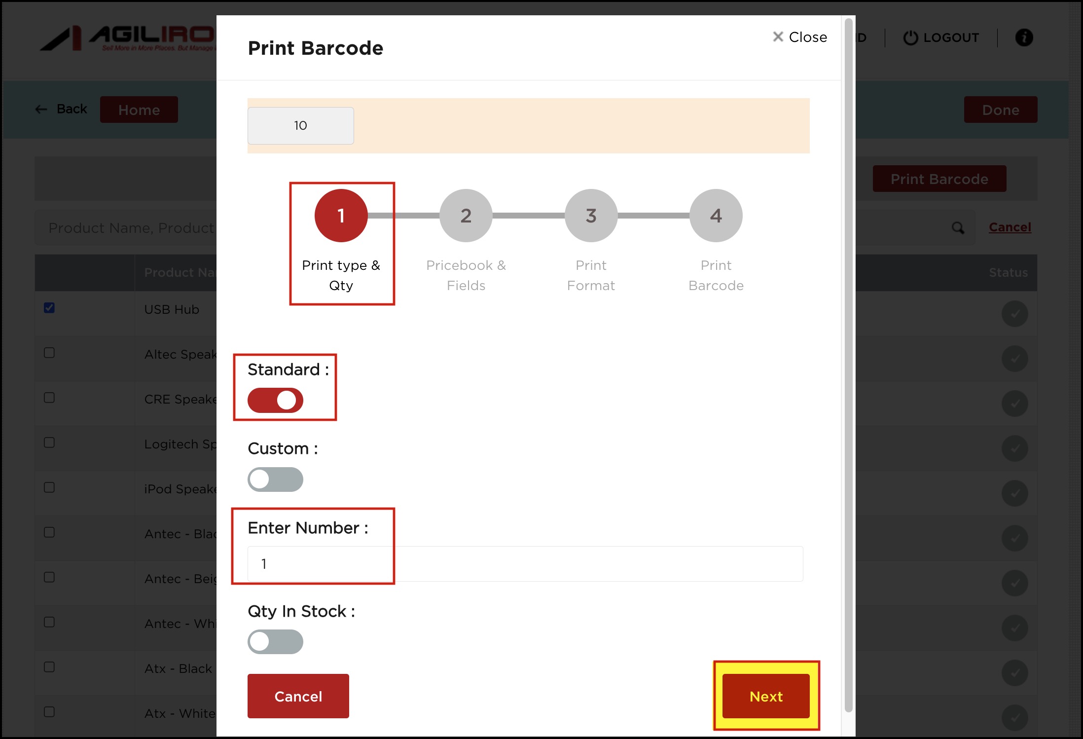 - Print Barcode pop-up screen will open, where in the first step (Print type & Qty) select the label type - Standard or Custom. Let's first view the Standard type.