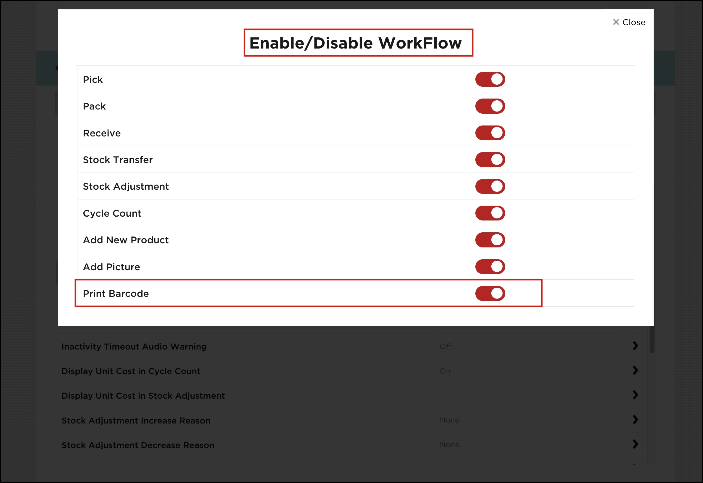 - After logging in to the warehouse app, first you need to click on Settings and go to Enable or Disable Workflows and enable the Print Barcode workflow.