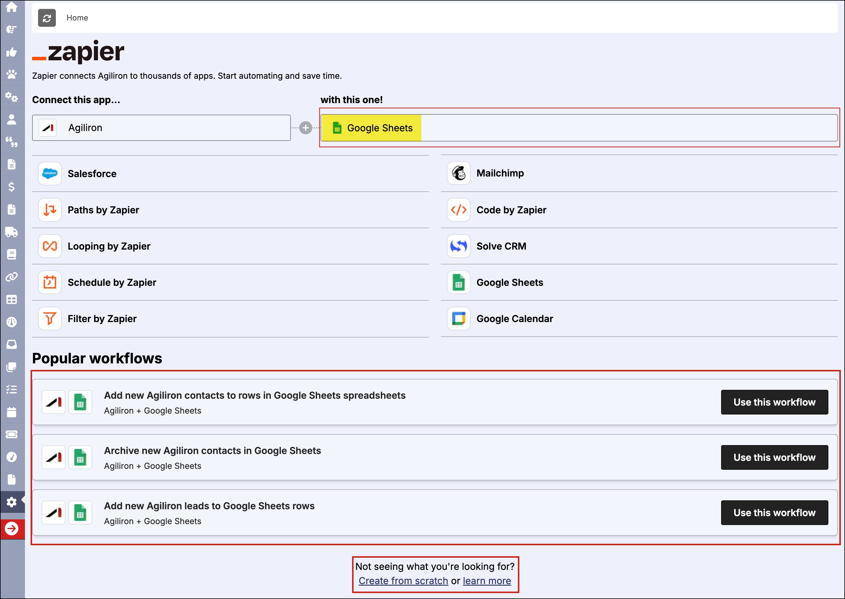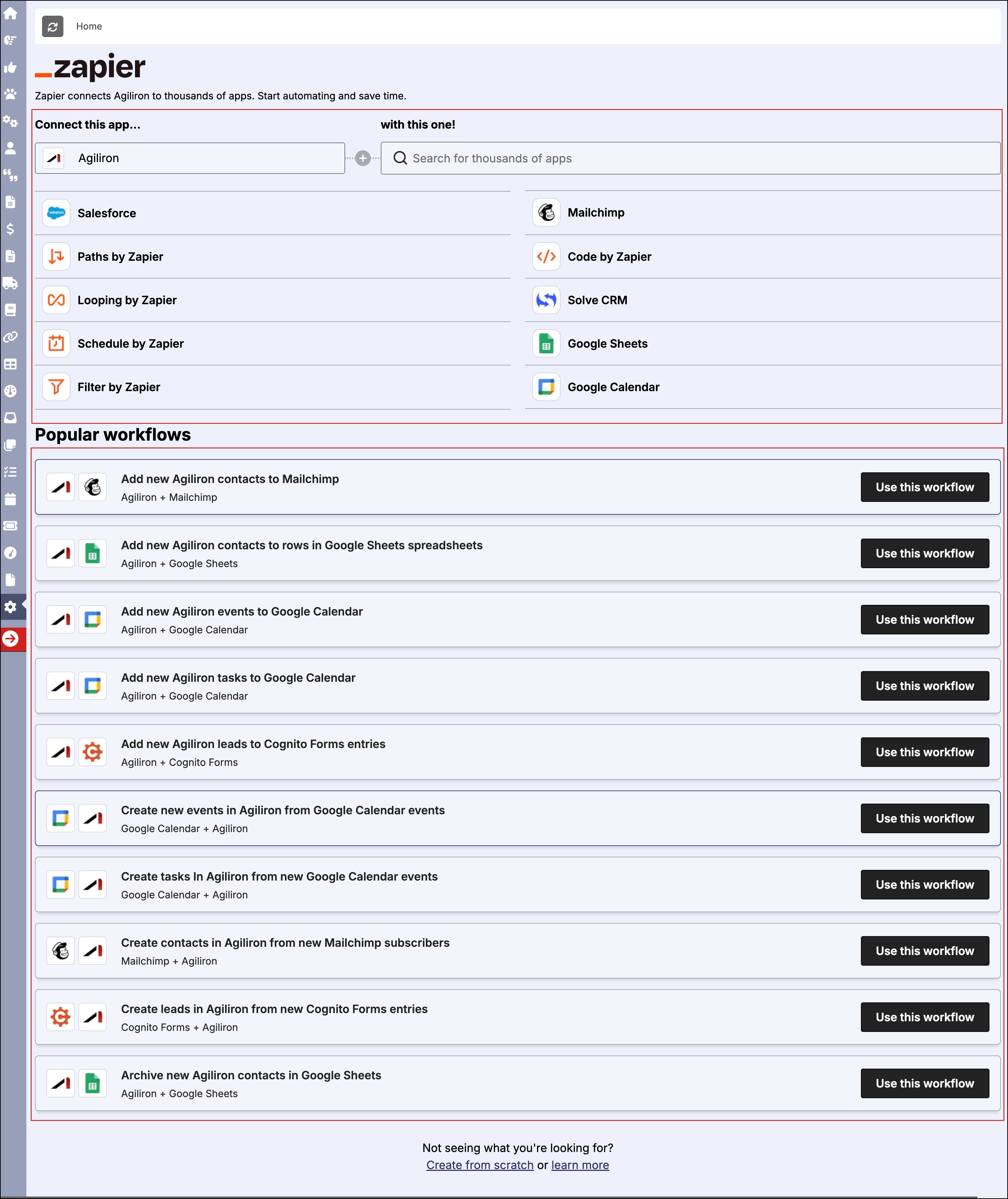 As soon as you select Agiliron and scroll down, you will find the zap templates that match your selected apps. These are the pre-build connections. Selecting any of these will instantly automate the workflow.